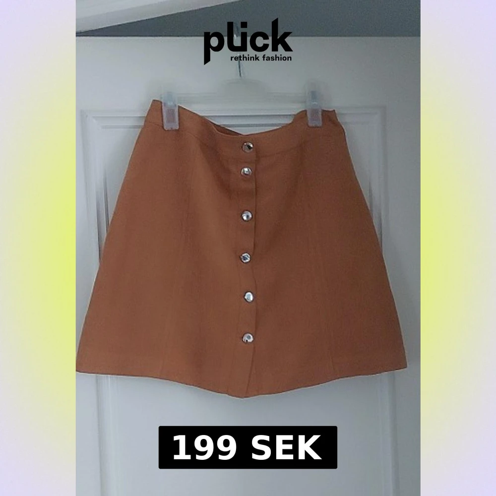 Snygg brun kortkjol i mockaimitation från H&M. Kjolen har en A-linjeformad siluett och silverfärgade knappar framtill som ger en cool retrovibe. Perfekt att styla med stickad tröja eller t-shirt. Materialet känns mjukt och har en matt finish.