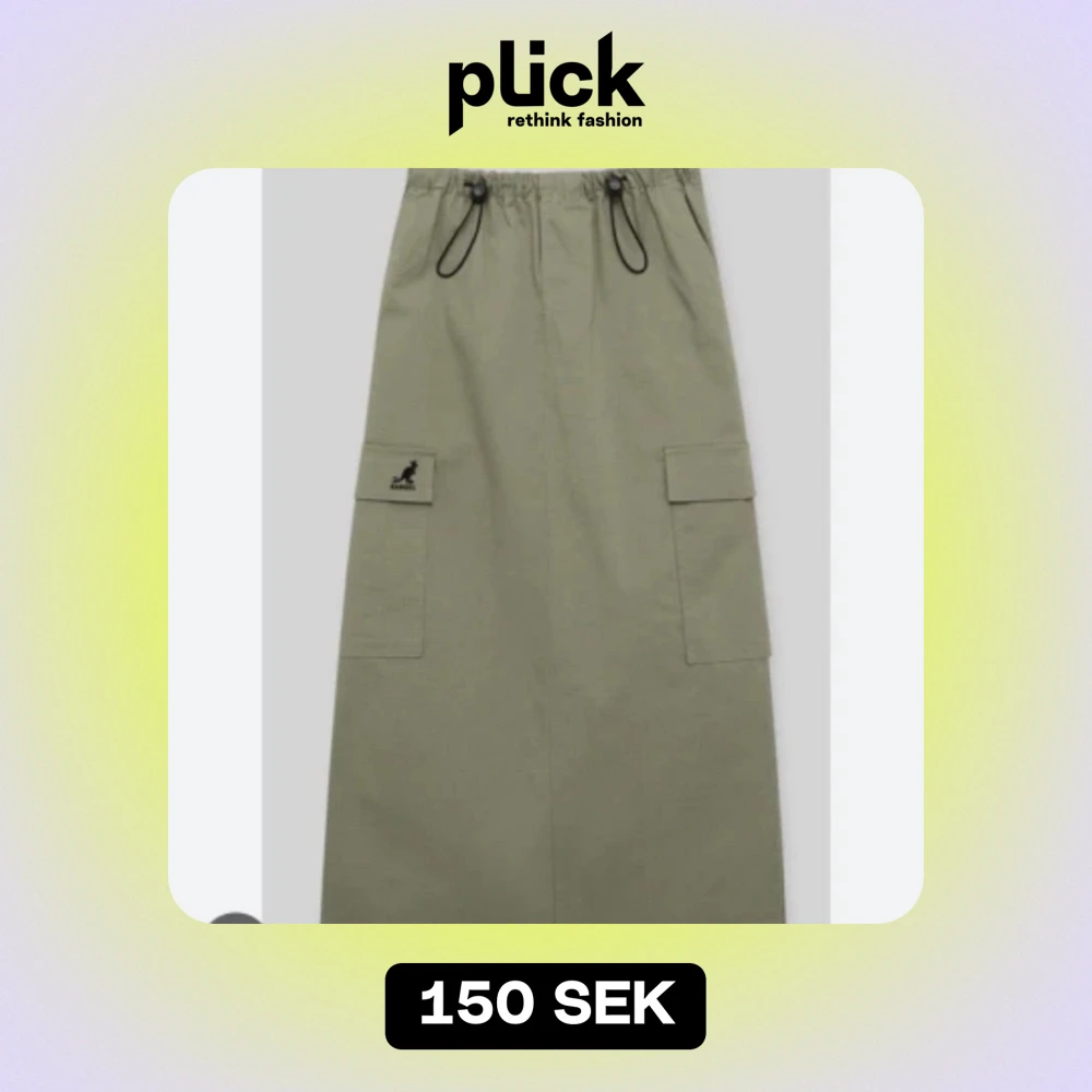 Lånad bild för uppmärksamhet! Snygg khakifärgad cargokjol från Pull and bear och Kangol. Slits där bak. Helt oanvänd! Köpt av mig på tradera men tyvärr var den fel storlek.