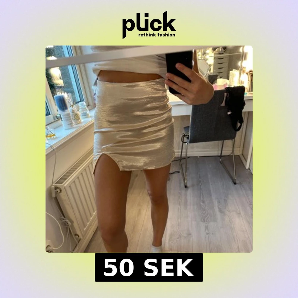 Säljer en glansig champagnefärgad minikjol i satin med tight passform och en liten slits framtill. Kjolen har hög midja och en snygg, slät yta som ger en lyxig vibe. Perfekt för dig som gillar att sticka ut med stilrena detaljer. Den är lite nopprig och har lite trådar som lösts upp🤍