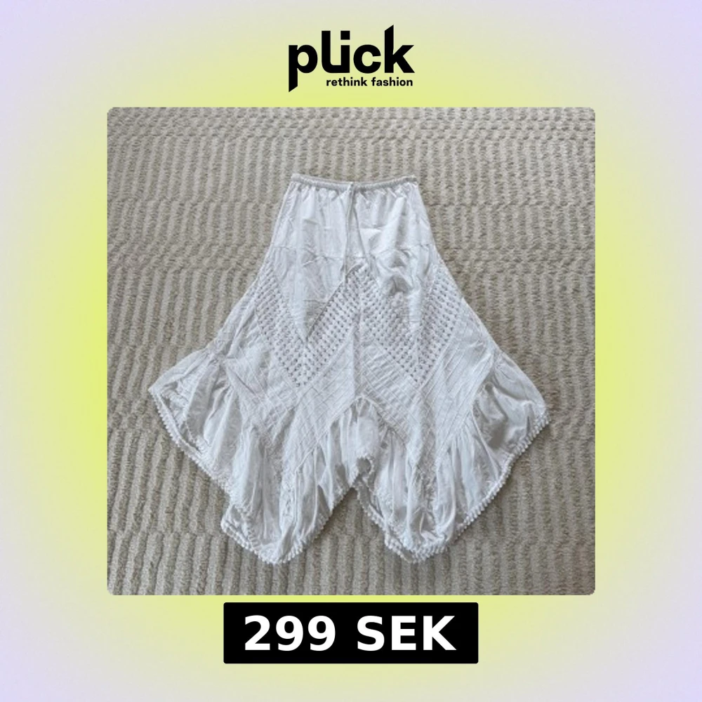Superfin vit långkjol från La Cotonnière med volangkant och broderade detaljer. Kjolen har snörning i midjan och är gjord i mjuk bomull. Storlek 36/S, men har resår i midjan vilket gör att den även passar mig som har M