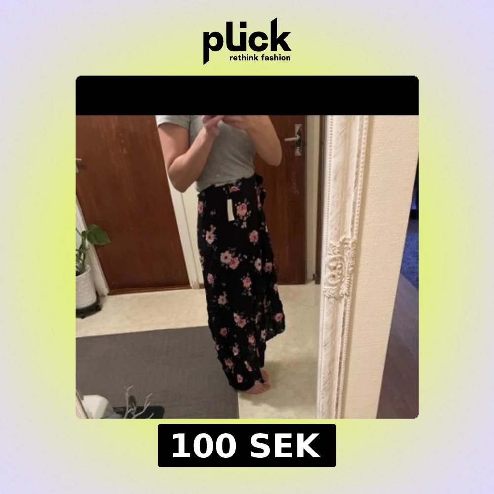 Supersnygg svart kjol med rosa och vita blommor från H&M Divided. Kjolen har en omlott-look med slits på sidan och är perfekt för dig som gillar en feminin stil. Längden är mitt emellan kort och lång, vilket gör den lätt att matcha.