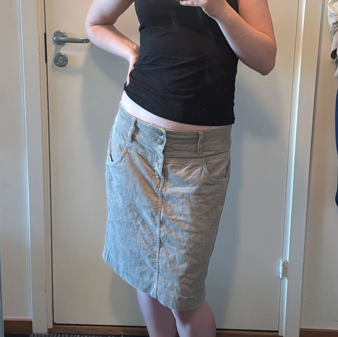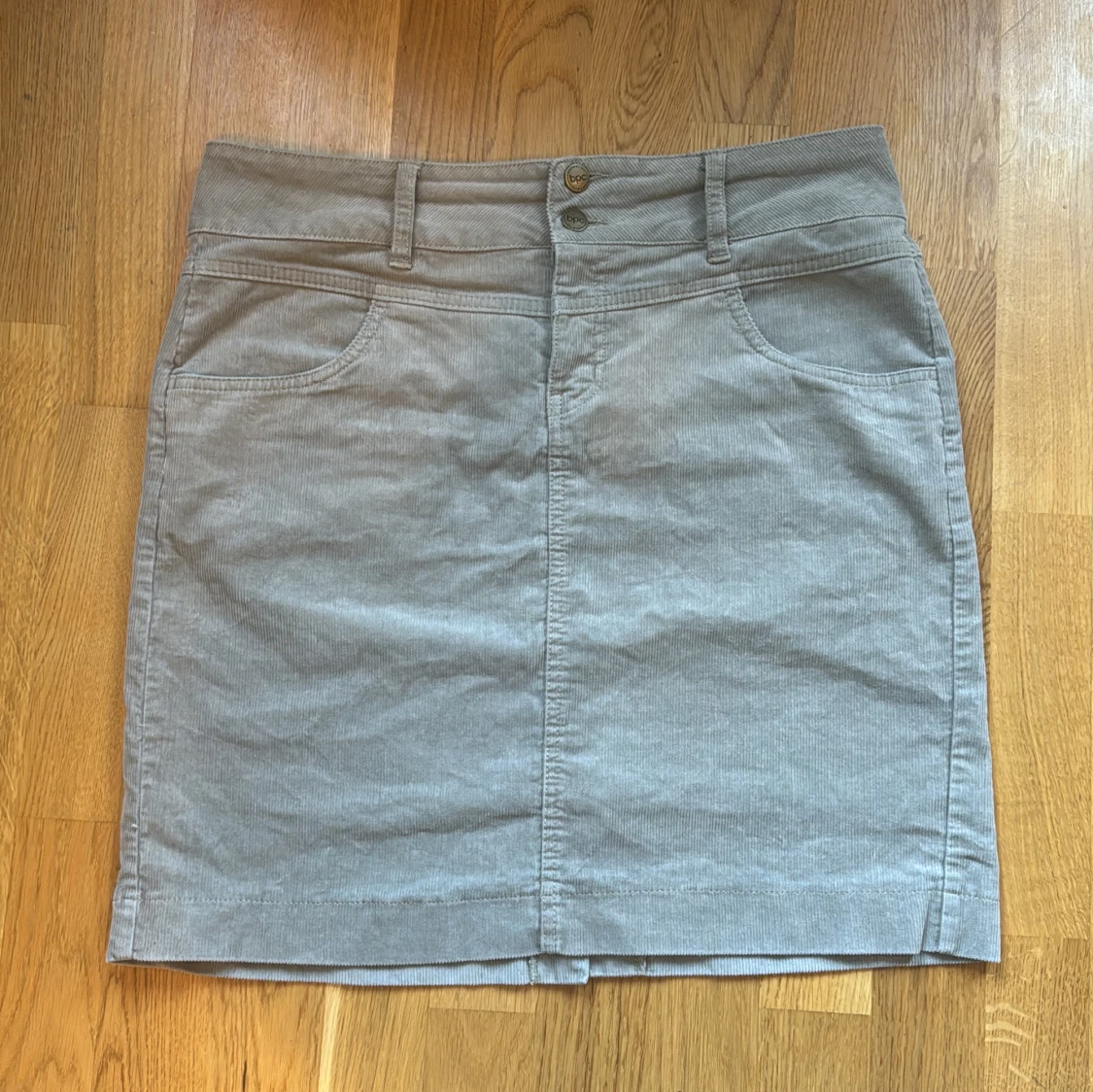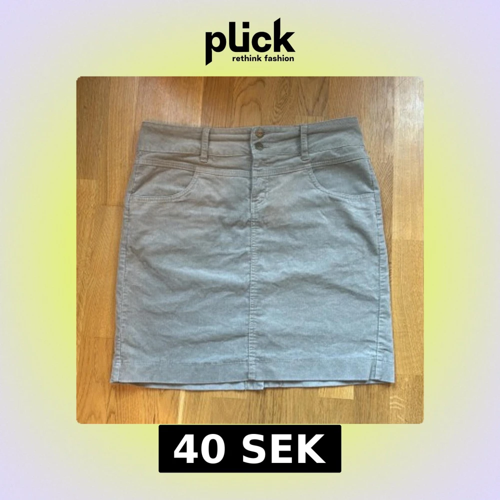 Säljer en grå lowwaist manchesterkjol från bpc med klassisk femficksdesign och bälteshällor. Kjolen har normal passform och stängs med dragkedja och två knappar framtill.