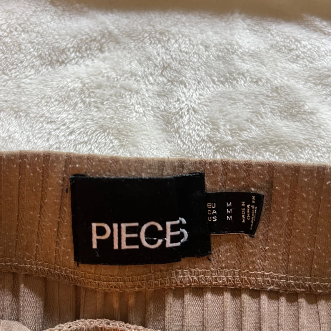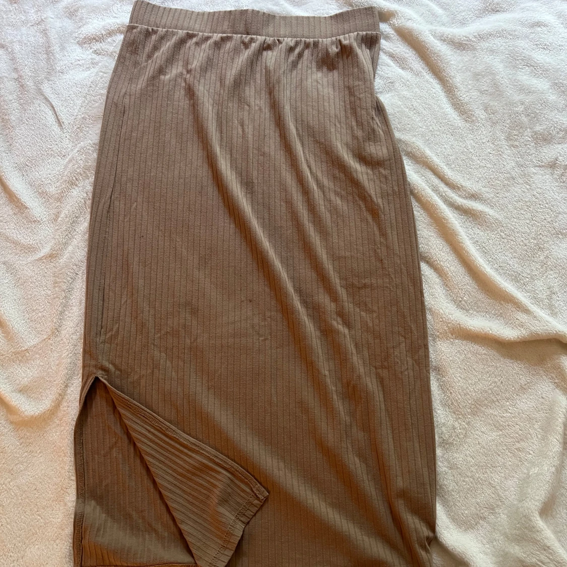 Säljer en beige ribbad kjol från PIECES i midilängd. Kjolen har en snygg slits på sidan och resår i midjan för extra komfort. Perfekt att styla med en croppad topp eller stickad tröja.
