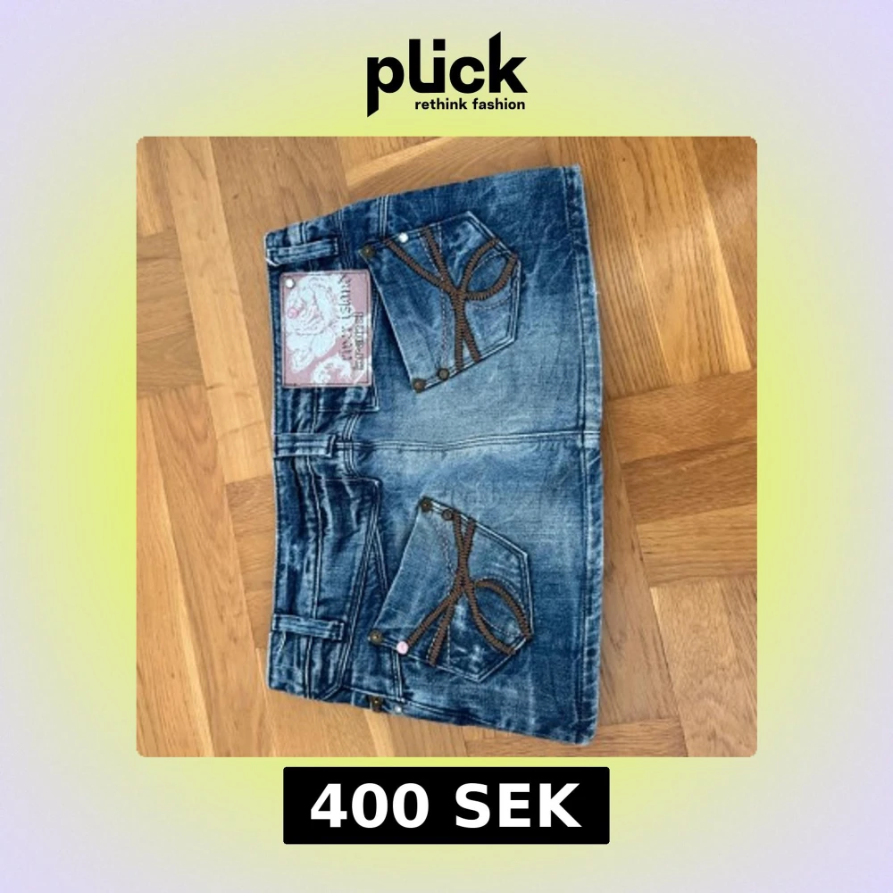 Säljer en cool blå jeanskjol med slitningar och dekorativa bruna sömmar på fickorna. Kjolen har två framfickor och två bakfickor med snygga detaljer. Perfekt för dig som gillar en avslappnad och trendig stil.
