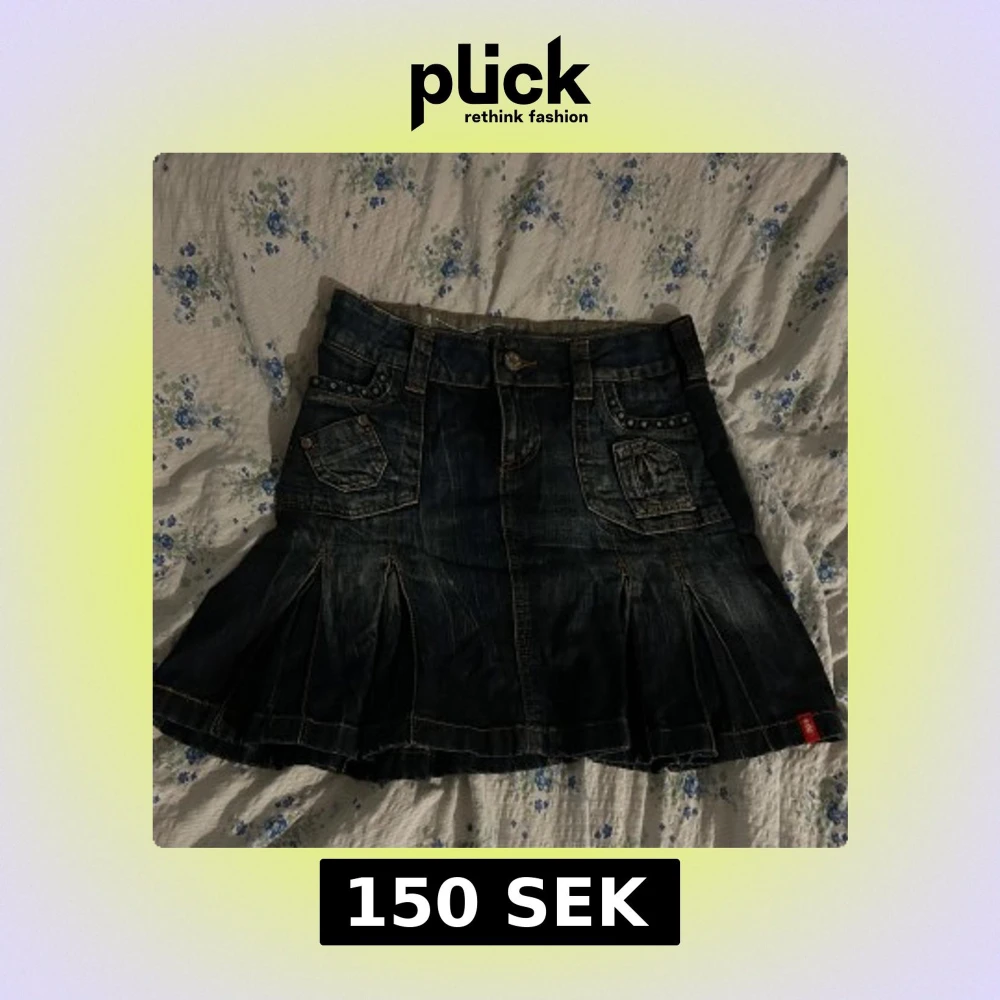 Snygg jeanskjol från edc by Esprit med dekorativa sömmar på fickorna och veckad nederkant. Jag har sytt in kjolen på sidan som ni kan se på bild 4 men det går lätt att sprätta upp. Knappen är lite missfärgad som man kan se på bild 5, men det är verkligen inget man tänker på