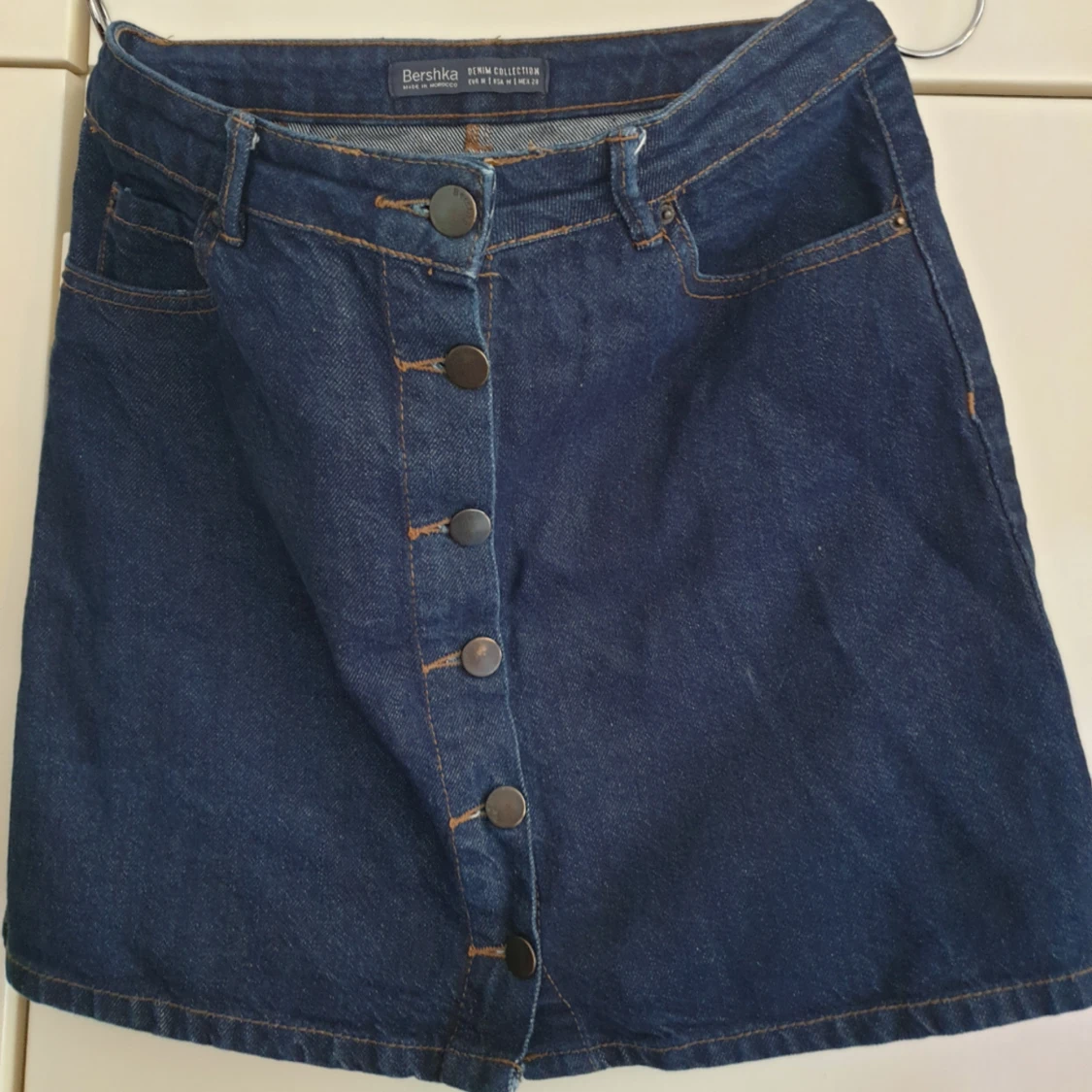 Mörk jeanskjol från Berska i bra skick. En av mina favoritkjolar som tyvärr inte används längre då den är för liten för mig! Frakt tillkommer