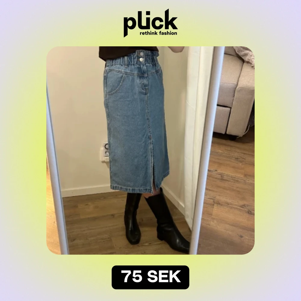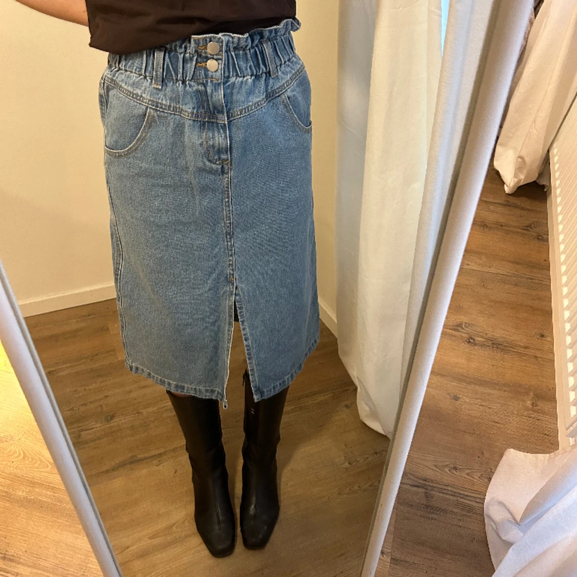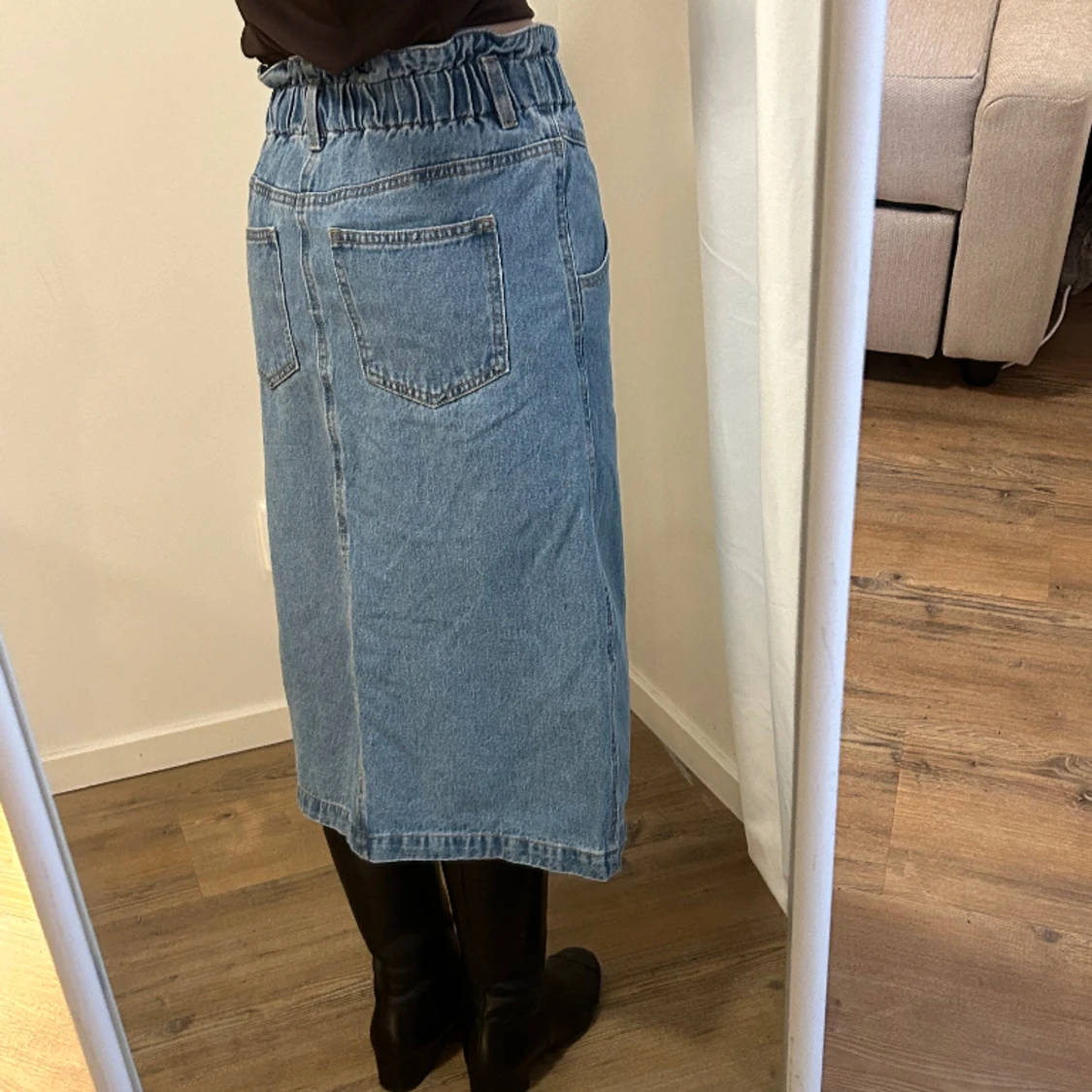 Jeanskjol med många fickor, liten slit i fram och resår i midjan