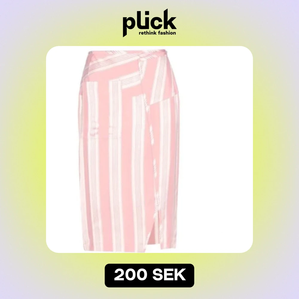 Laxrosa- och vitrandig midikjol i satin från Acne Studios. Modell Karlotta y 2016. Storlek 38. Dragkedja på sidan som funkar som den ska - i övrigt två små skador i tyget samt liten fläck vilka syns på bild. Unik kjol 🌸