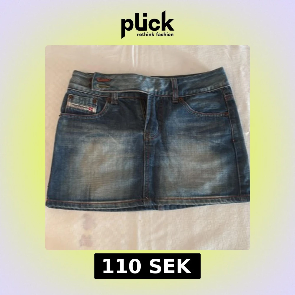 Snygg blå jeanskjol från Diesel. Kjolen har dragkedja och dubbla knappar framtill samt tydlig logga på fickan. Knapp saknas dock vid gylfen men kan användas ändå då det finns ytterligare två knappar att knäppa vid sidan, se bild 1 & 3.