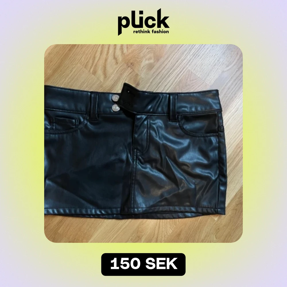 En svart kortkjol från Divided i skinnimitation. Kjolen har två framfickor och två bakfickor samt bälteshällor och två knappar i midjan.