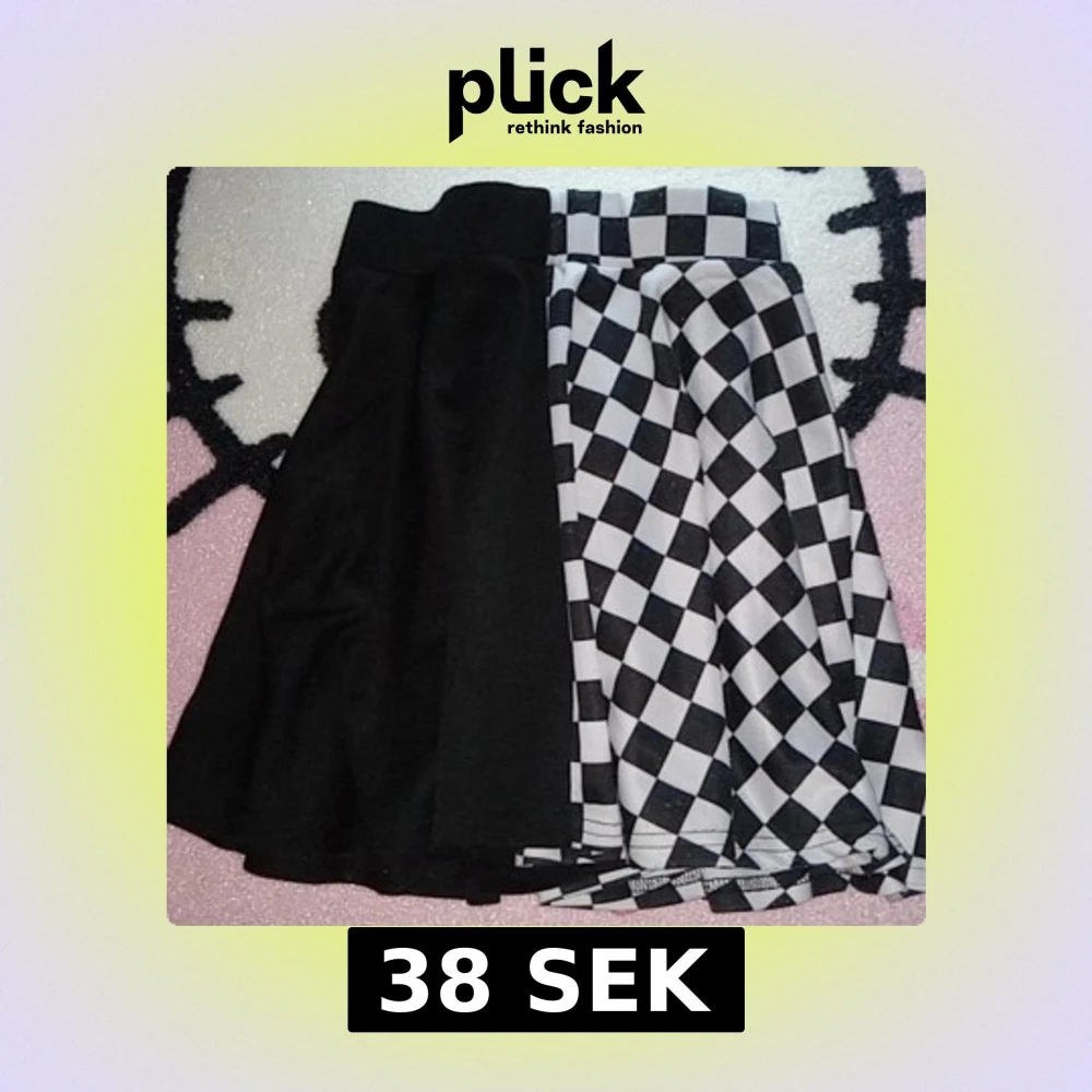Halv svart halv rutig kjol. Strechig, mjuk och når precis över käna. Oanvänd sen 2021. Har nåppor på rutiga sidan.