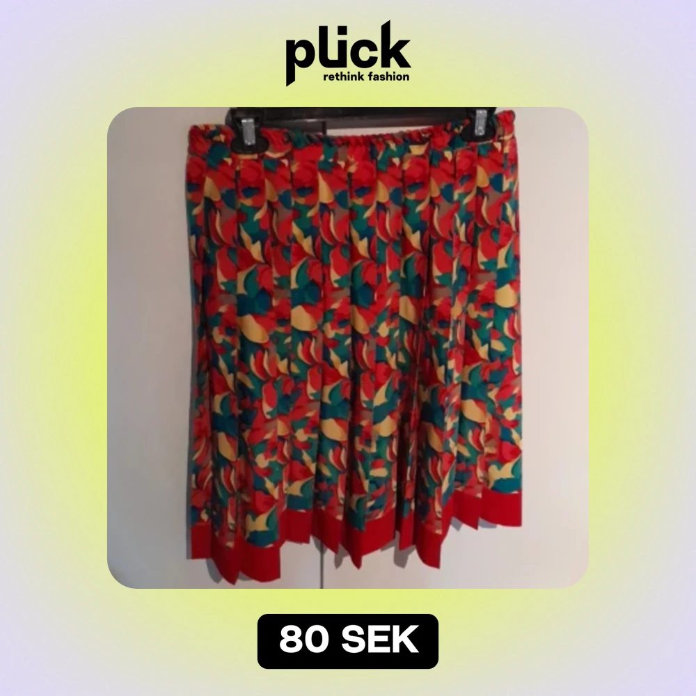 En färgglad veckad kjol, går ner till knäna. Storlek L men passar M/XL också.