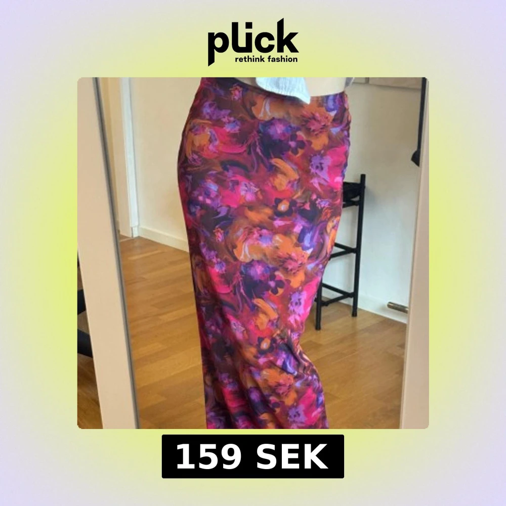 Säljer en långkjol från PrettyLittleThing med färgstarkt blommigt mönster i lila, rosa och orange toner. Kjolen har en figurnära passform och en liten slits bak. Materialet känns lätt och följsamt, perfekt för dig som vill sticka ut med en cool look.