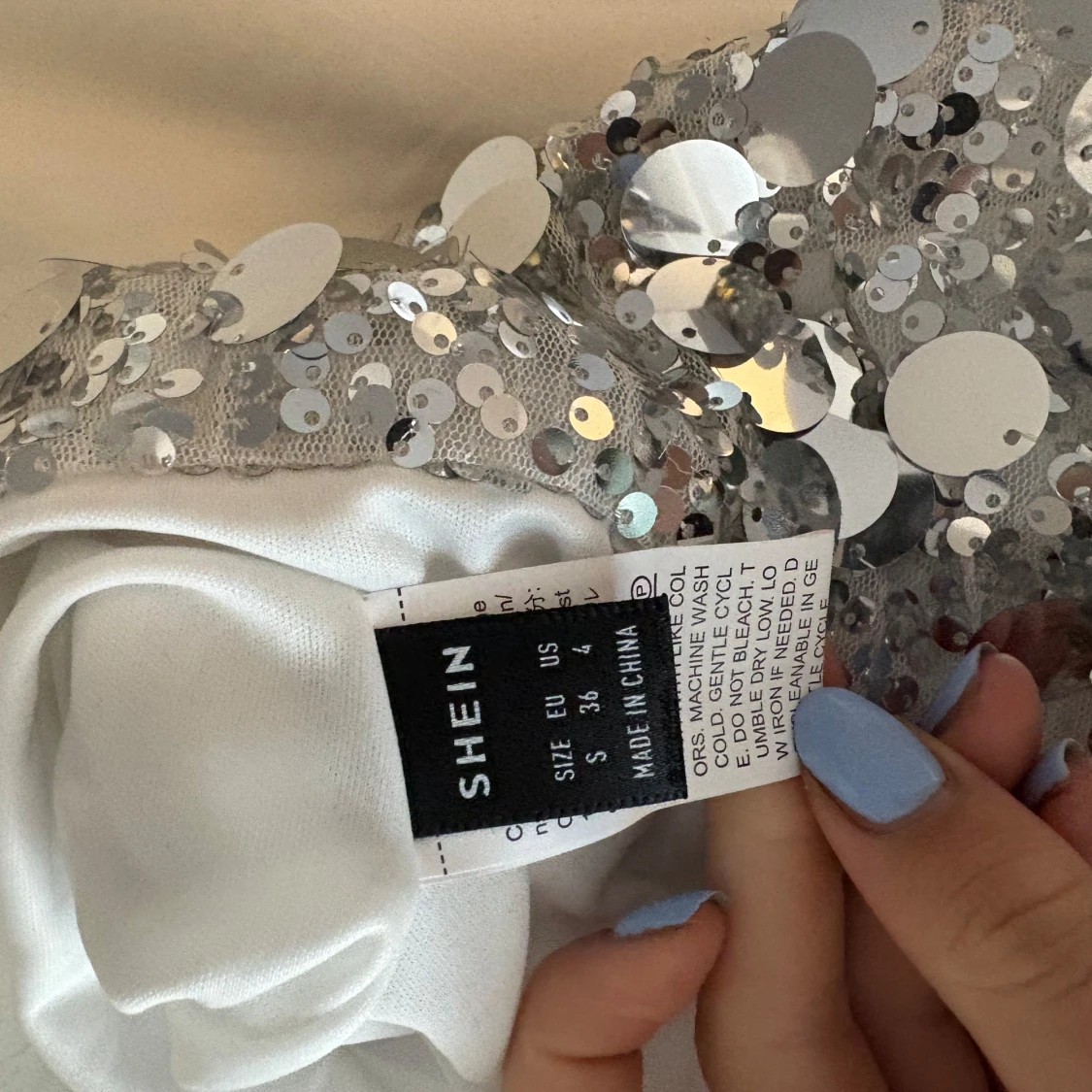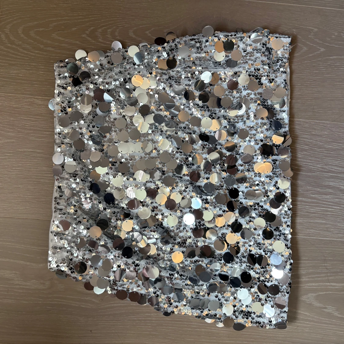 Säljer en glittrig silverfärgad minikjol täckt med stora paljetter som ger en riktigt festlig look. Kjolen är kort och har en tight passform.
