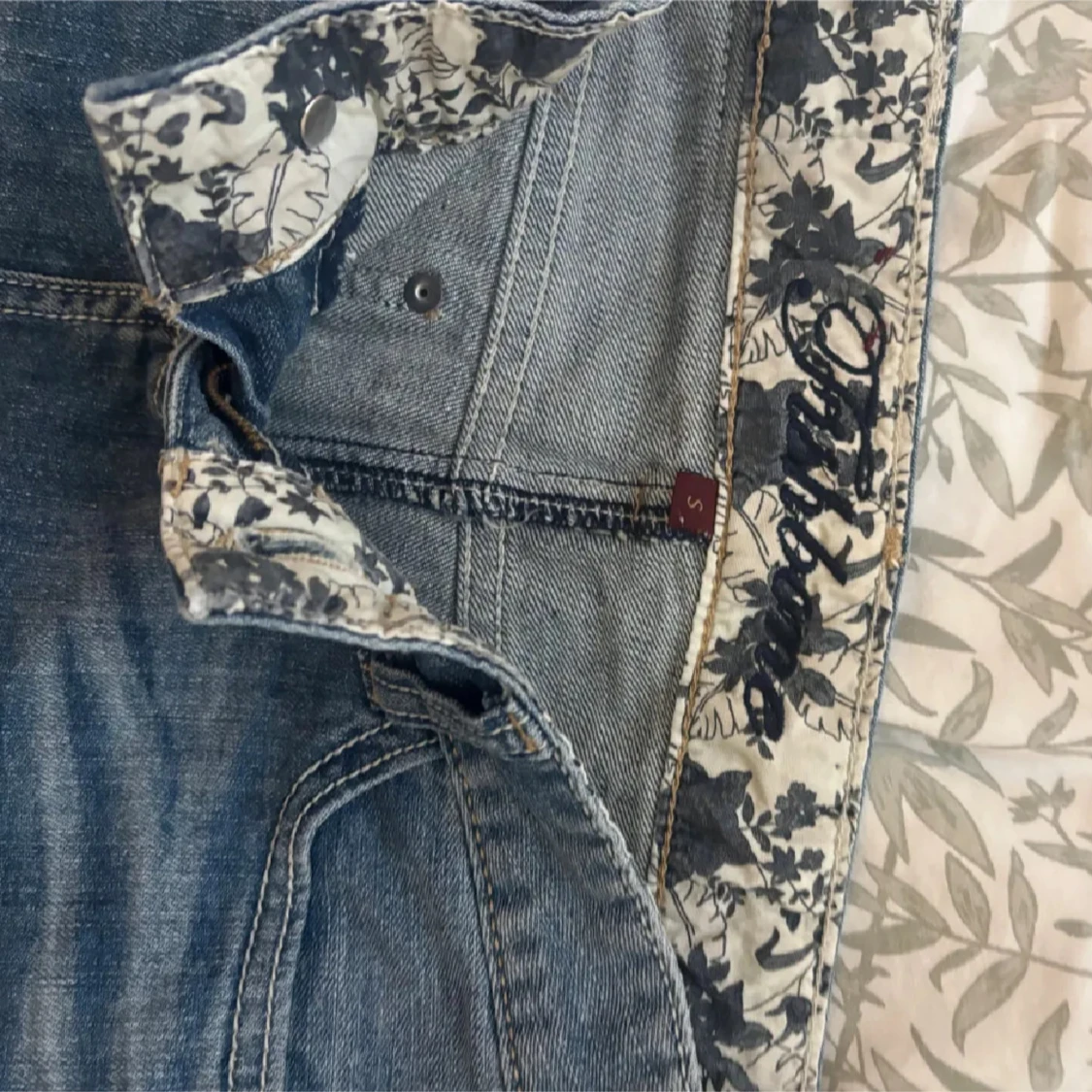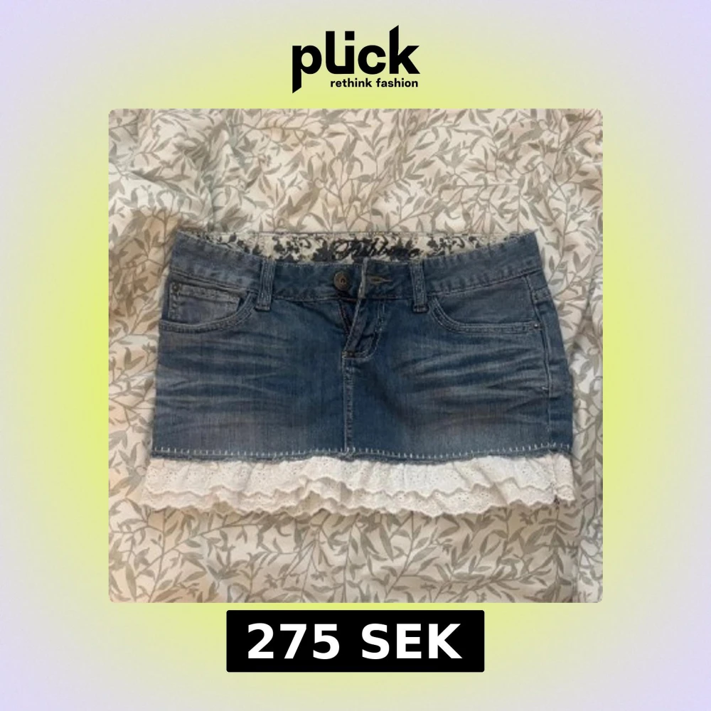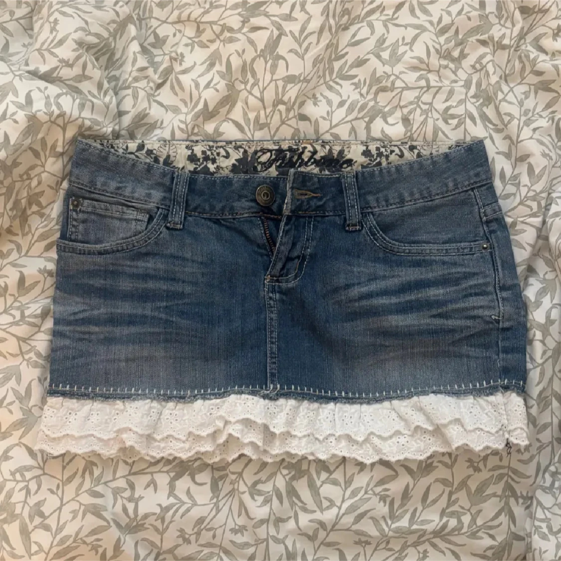 Säljer en blå jeanskjol från Fishbone med egensydd vit spetsvolang längst ner. Kjolen har klassisk femficksdesign, knapp och dragkedja framtill samt dekorativt mönstrad insida. Snygg och feminin med normal passform och coola detaljer.
