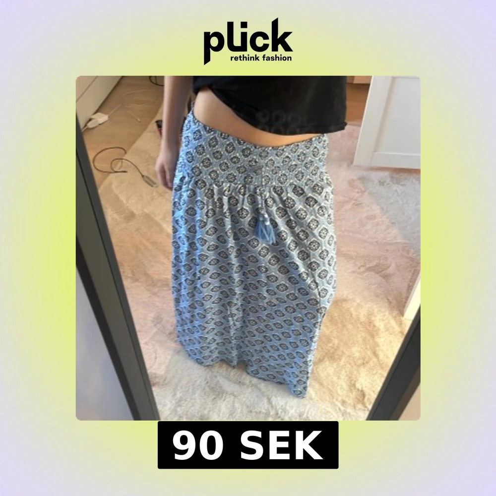Säljer en blå långkjol från Gina Tricot med ett snyggt mönster i mörkblått och vitt. Kjolen har en elastisk midja och dekorativa tofsar framtill. Perfekt för sommaren😀