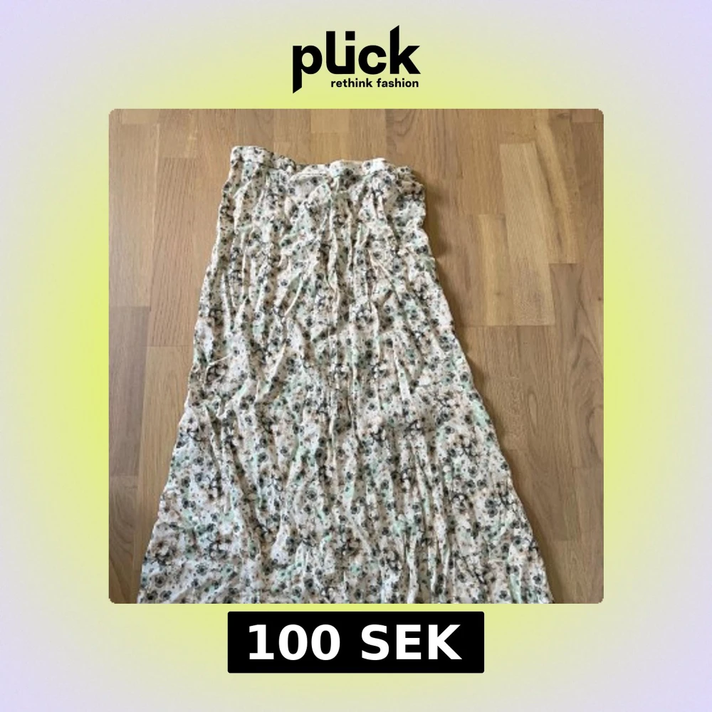 Långkjol från H&M i storlek 40 med blommigt mönster i beige, grönt och svart. Kjolen har en ljus bas och stängs med dragkedja i sidan.