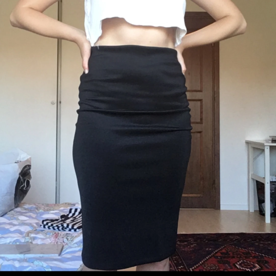 Svart, halvglansig kjol. Strl 38 men passar även mig som 36. Sitter åt snyggt iom lite tjockare tyg. Blir liksom inte sladdrig eller rynkig