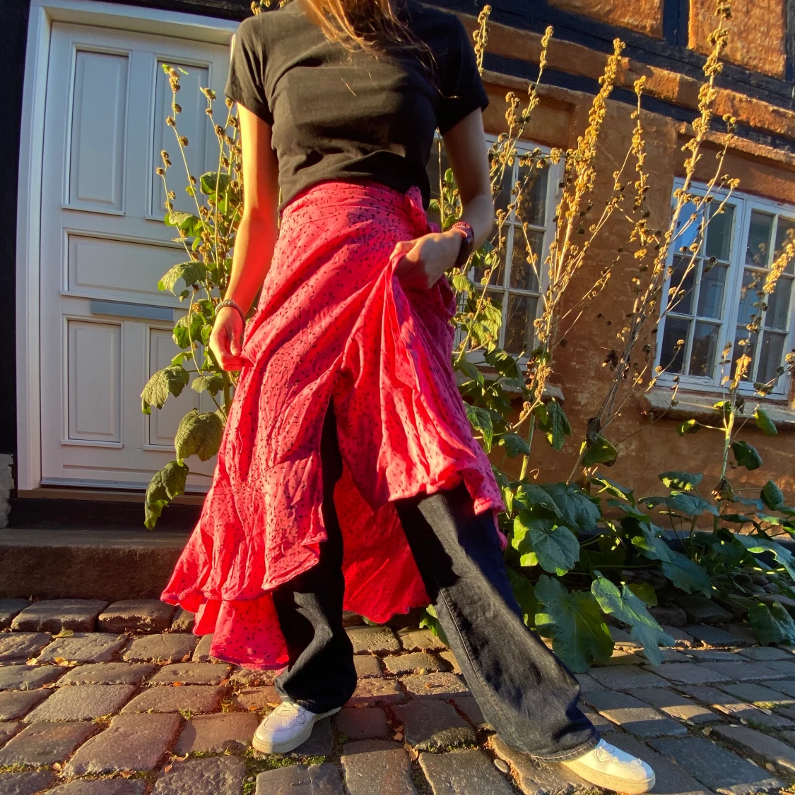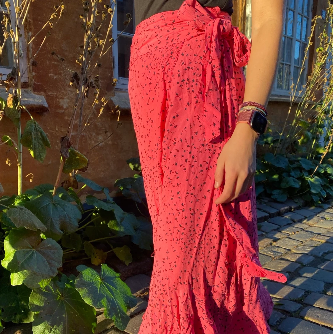 Pink ganni nederdel med små sorte blomster. Slå om og flæsekant