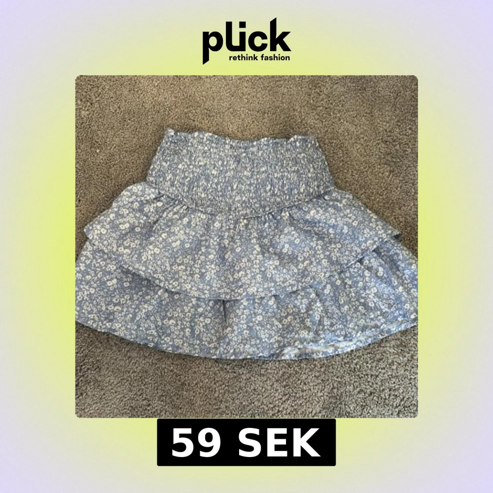 Supersöt blå kortkjol med vita små blommor och bred smock i midjan. Kjolen har dubbla volanger som ger en flowy och lekfull känsla. Perfekt för varma dagar och lätt att matcha med en enkel topp.