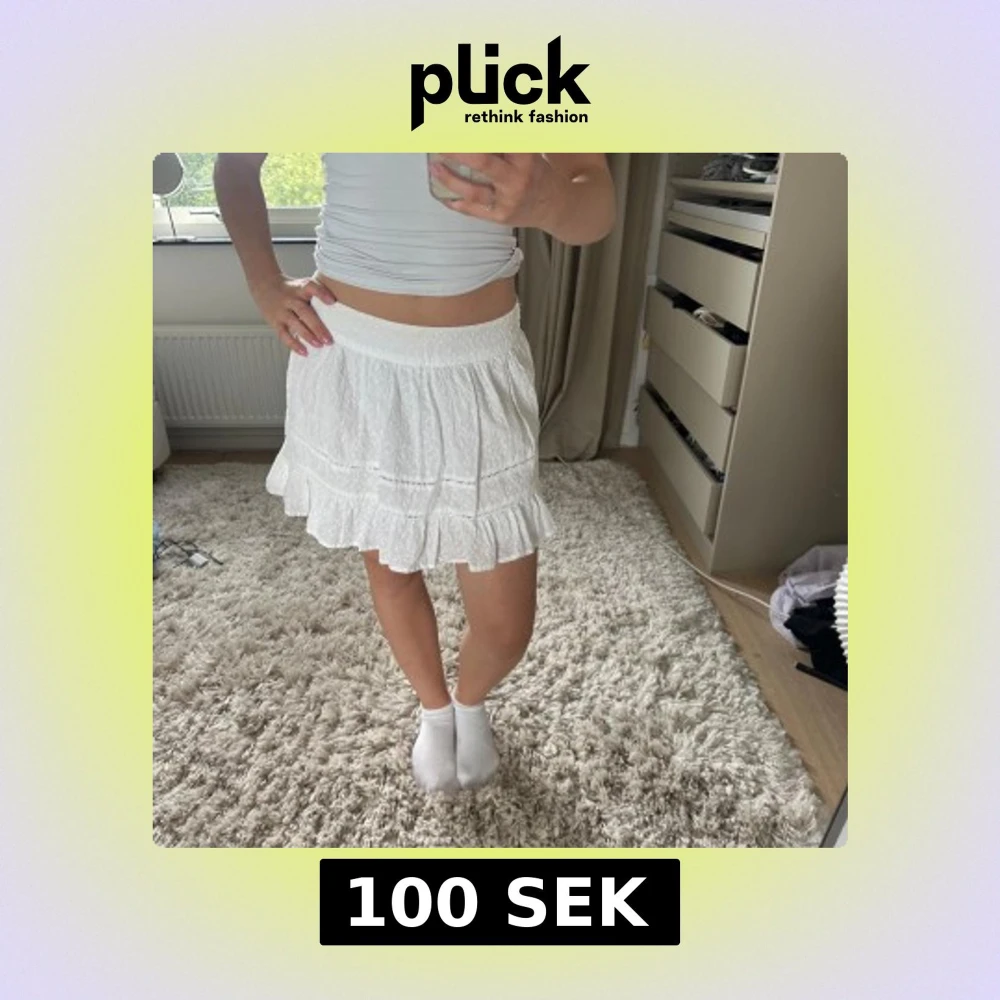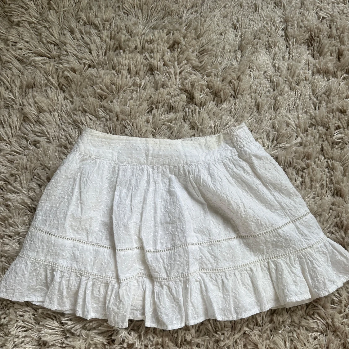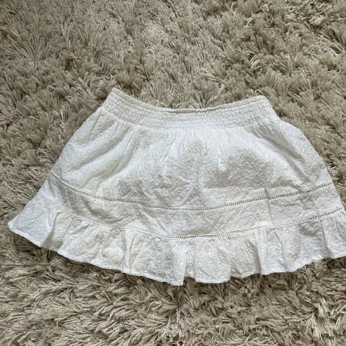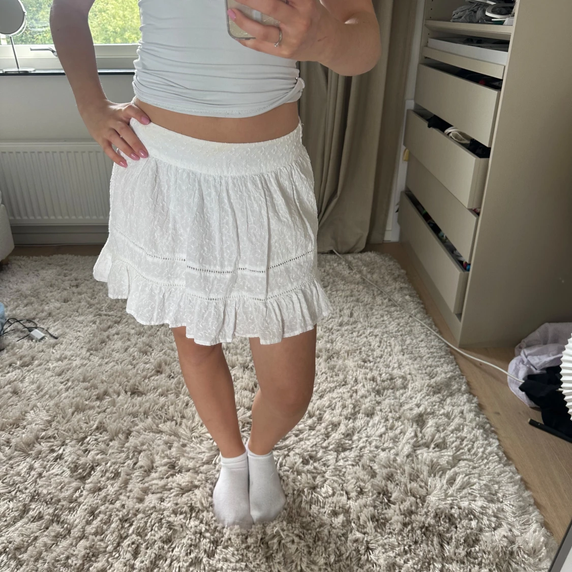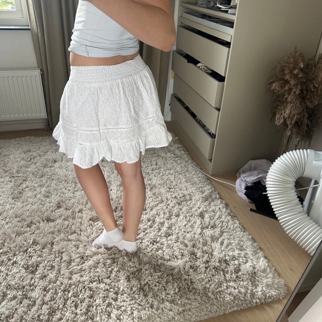 Supersöt vit kortkjol med volangkant och broderade detaljer. Kjolen har resår i midjan för en bekväm passform och är gjord i ett lätt bomullstyg. Perfekt för varma dagar och ger en fräsch och somrig vibe.