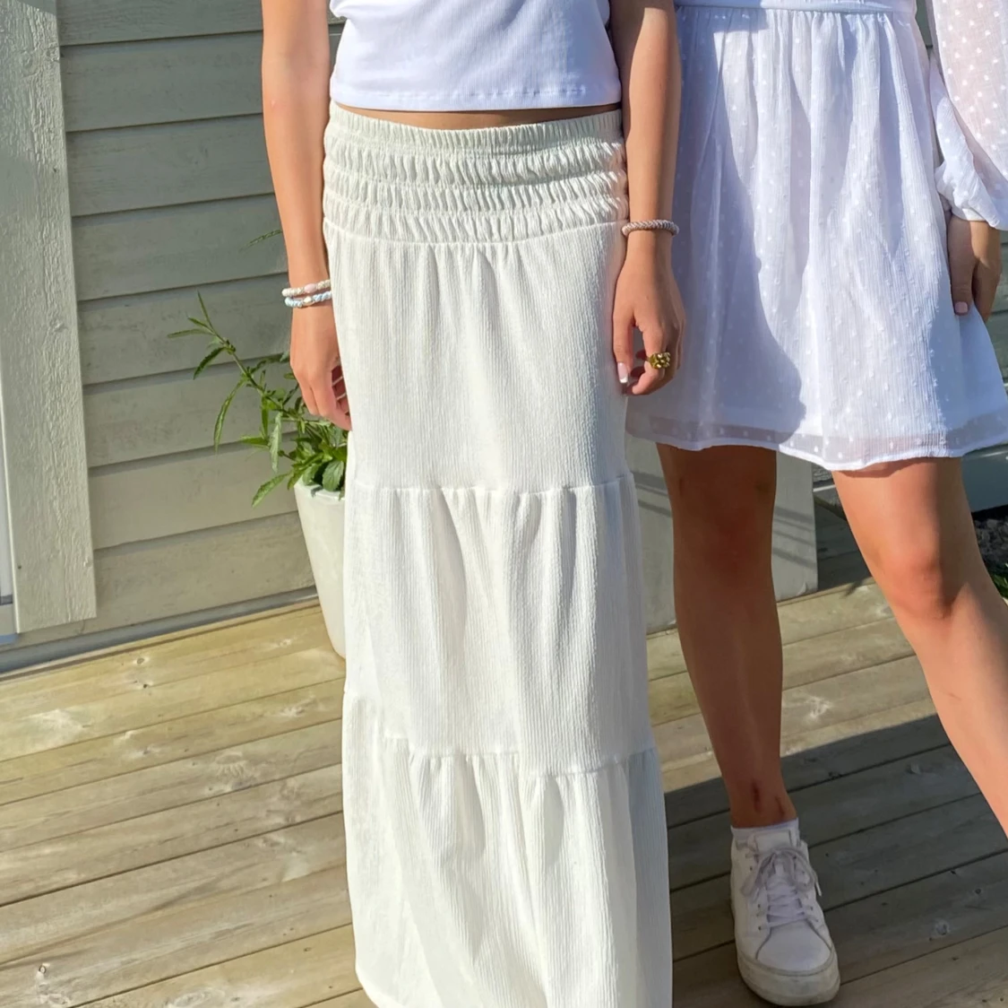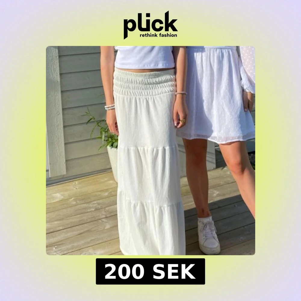 Säljer en vit långkjol med bred smock i midjan och volangdetaljer. Kjolen har en luftig och flowy känsla, perfekt för varma dagar. Enkel att matcha med olika toppar för en fräsch look. Jag är 164 och säljer pga att den är lite kort💞💞💞🫰🏼