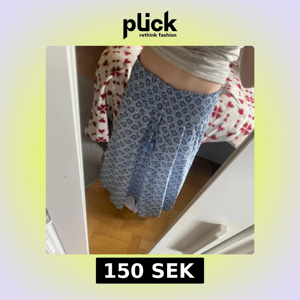 Säljer denna långkjol i blått och vitt med dekorativt mönster och smock i midjan. Kjolen har knytband med tofsar framtill. Luftigt och skönt material