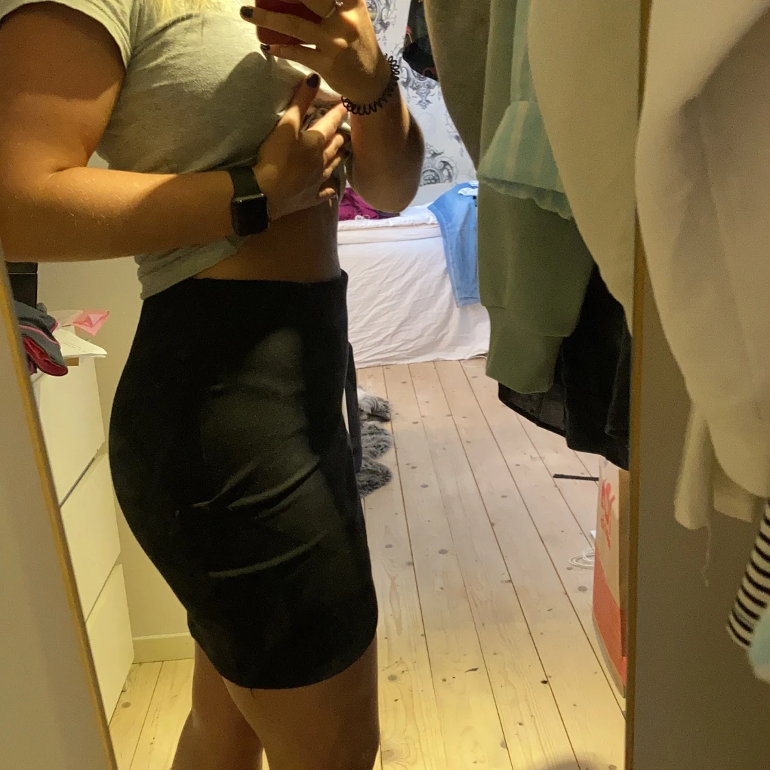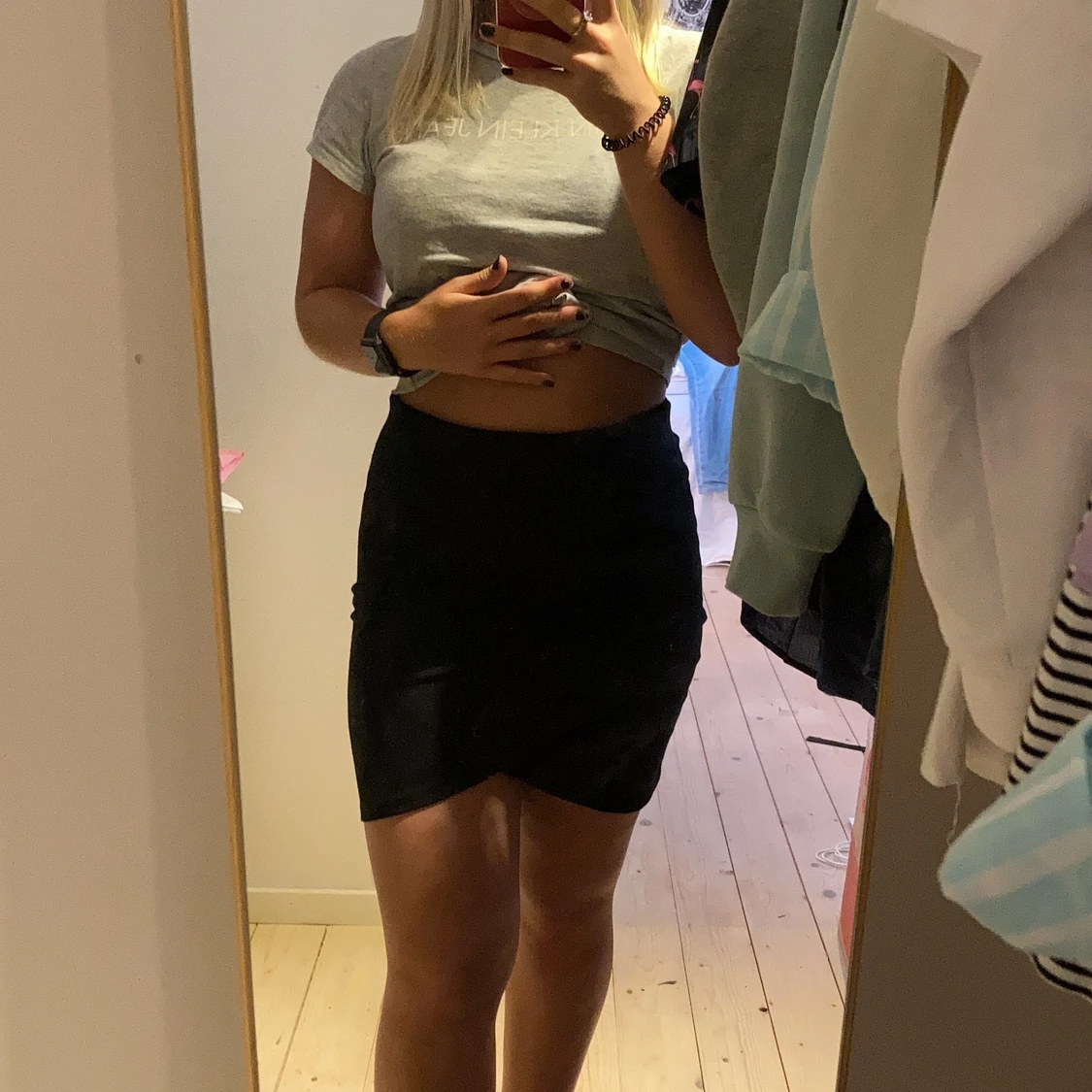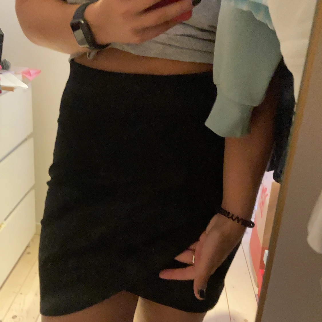 En till svart kjol som är rätt så kort och sydd med ett lager över det andra. Köparen står för frakten.