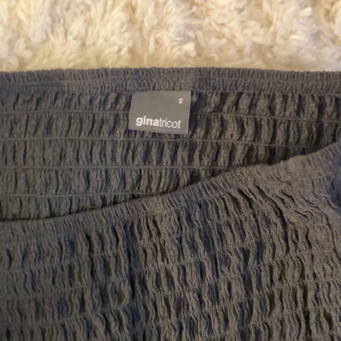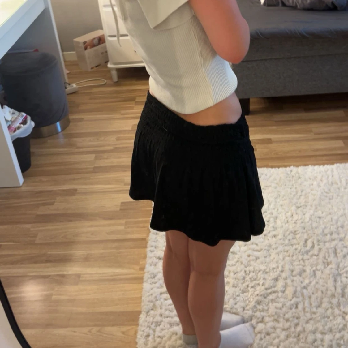Supersöt svart kortkjol från Gina Tricot med smockad midja och lätt volangig nederkant. Kjolen är enkel och stilren, perfekt till crop tops eller hoodies. Materialet är mjukt och stretchigt för en bekväm passform.