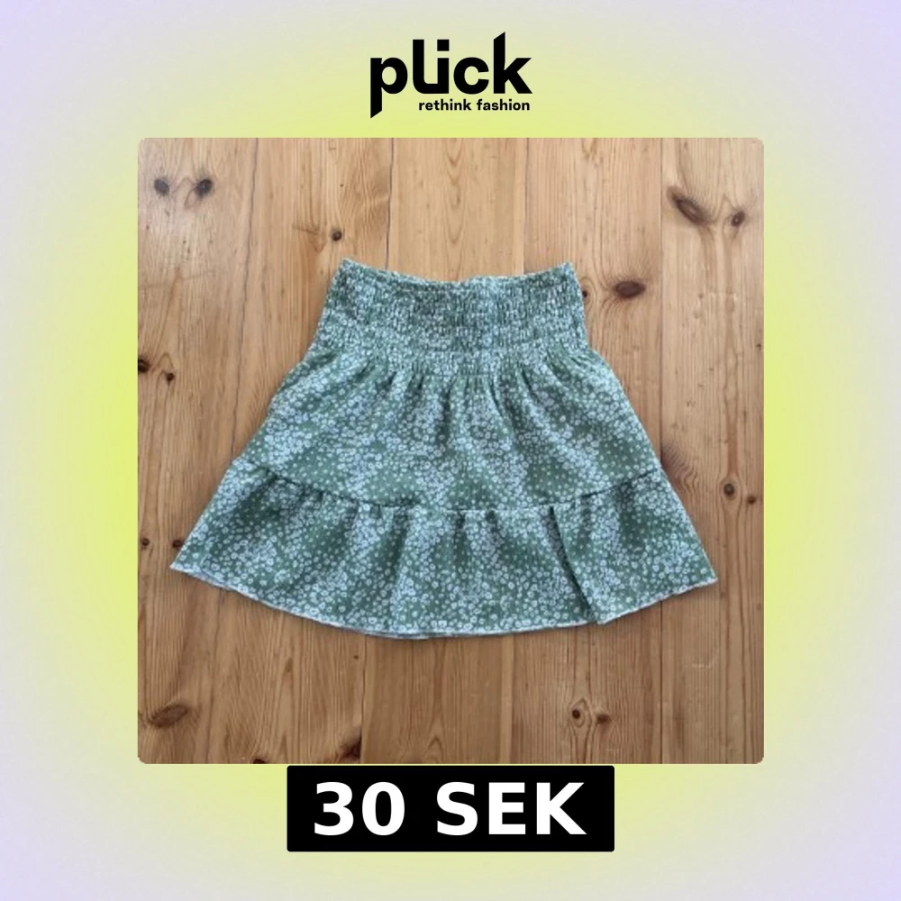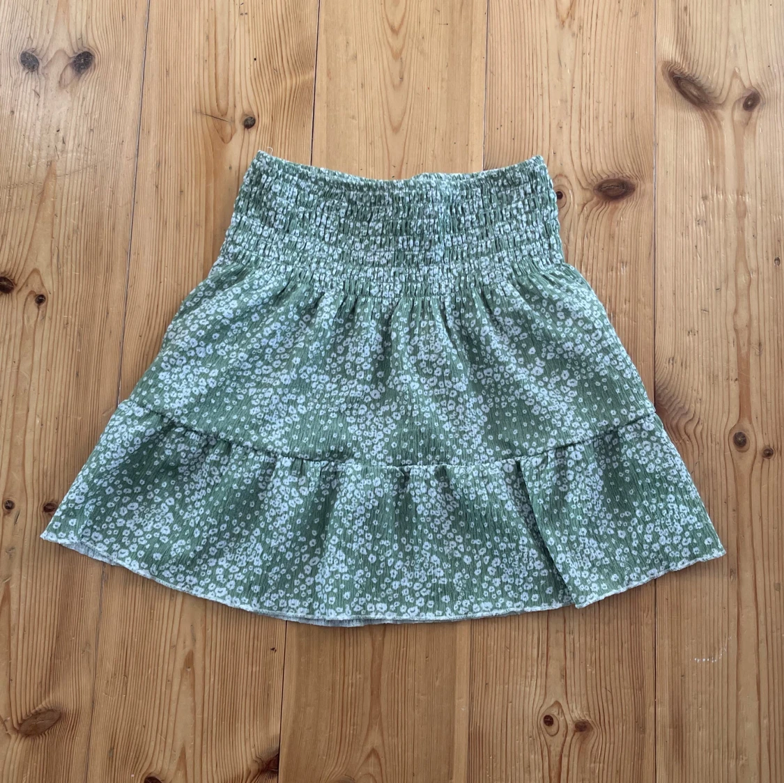 Supersöt grön kortkjol från Gina Tricot i storlek XS. Kjolen har små vita blommor, bred smock i midjan och volang nertill. Perfekt för vår och sommar, lätt och luftig känsla. Kan användas som både topp och kjol