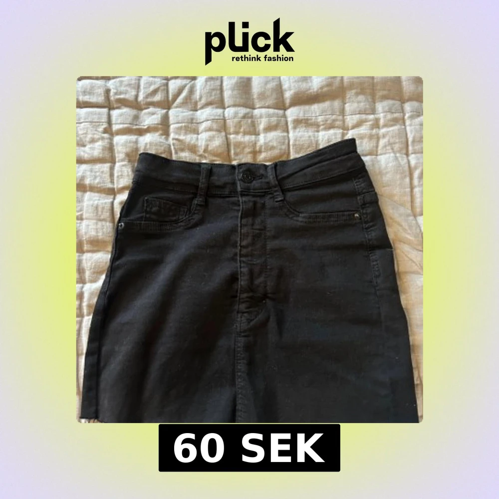Svart kort jeanskjol från Gina tricot. Klassiska fem fickor och rå, fransig nederkant. Kjolen har bälteshällor och knappstängning framtill. Perfekt för en cool och avslappnad stil.
