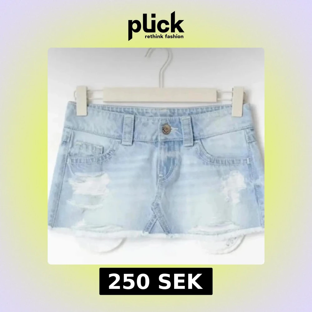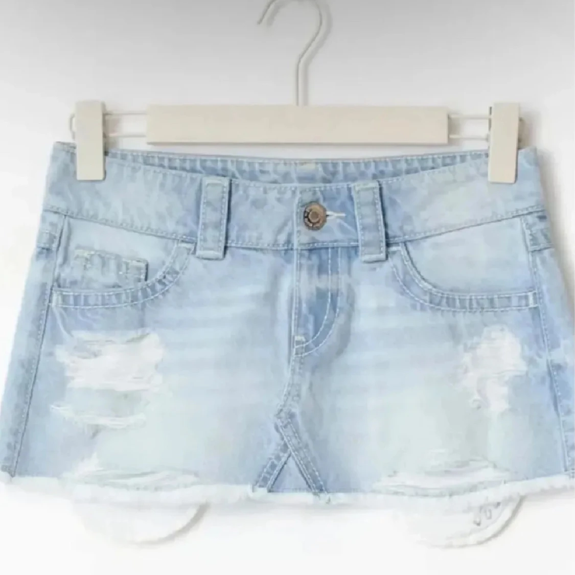 Säljer en ljusblå kort jeanskjol med slitna detaljer och fransad kant. Kjolen har klassiska fickor fram och bak, bälteshällor och knappstängning. Perfekt för dig som gillar en chill och trendig look.