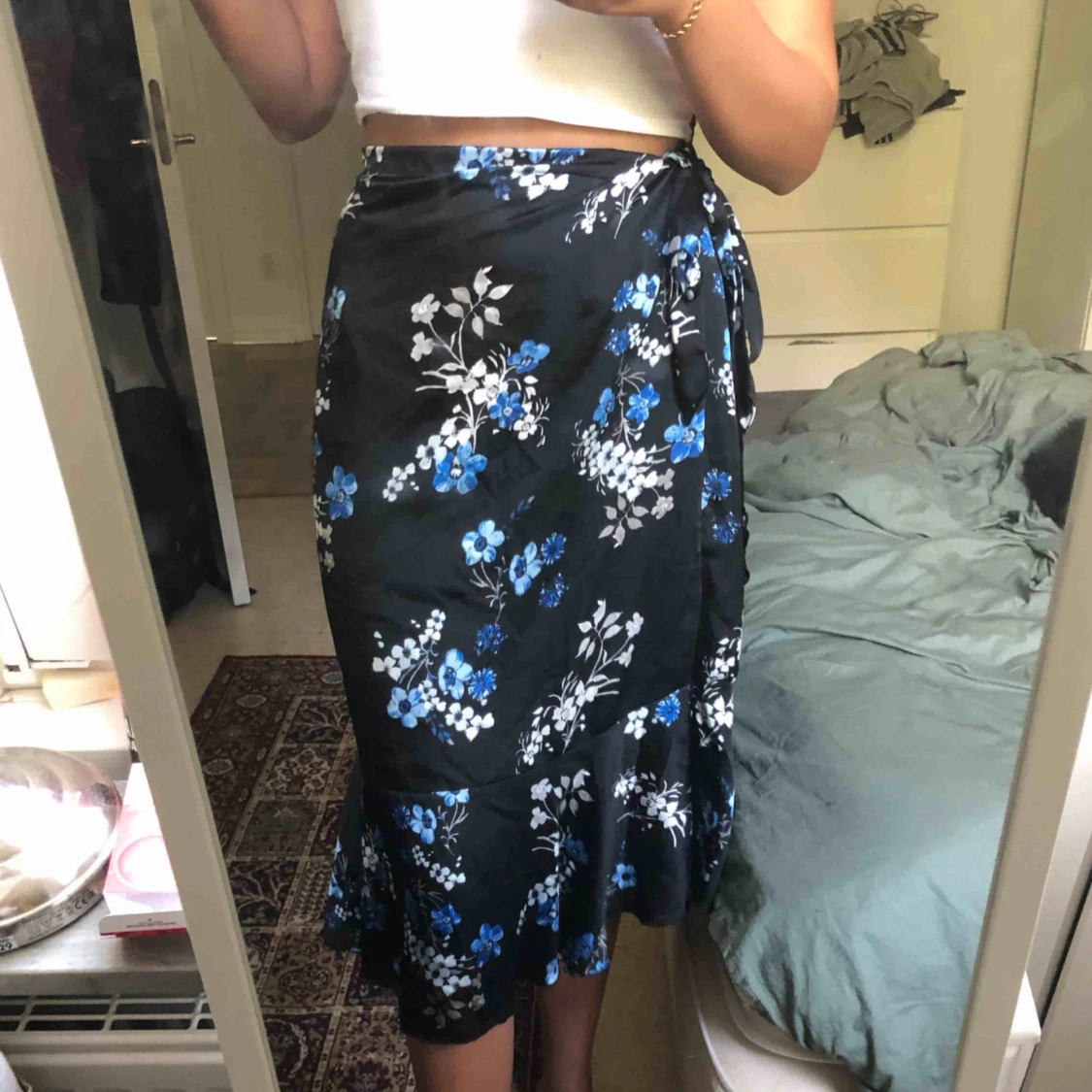 Svart kjol med blå blommor som man knyter i midjan, använd endast två gånger💘