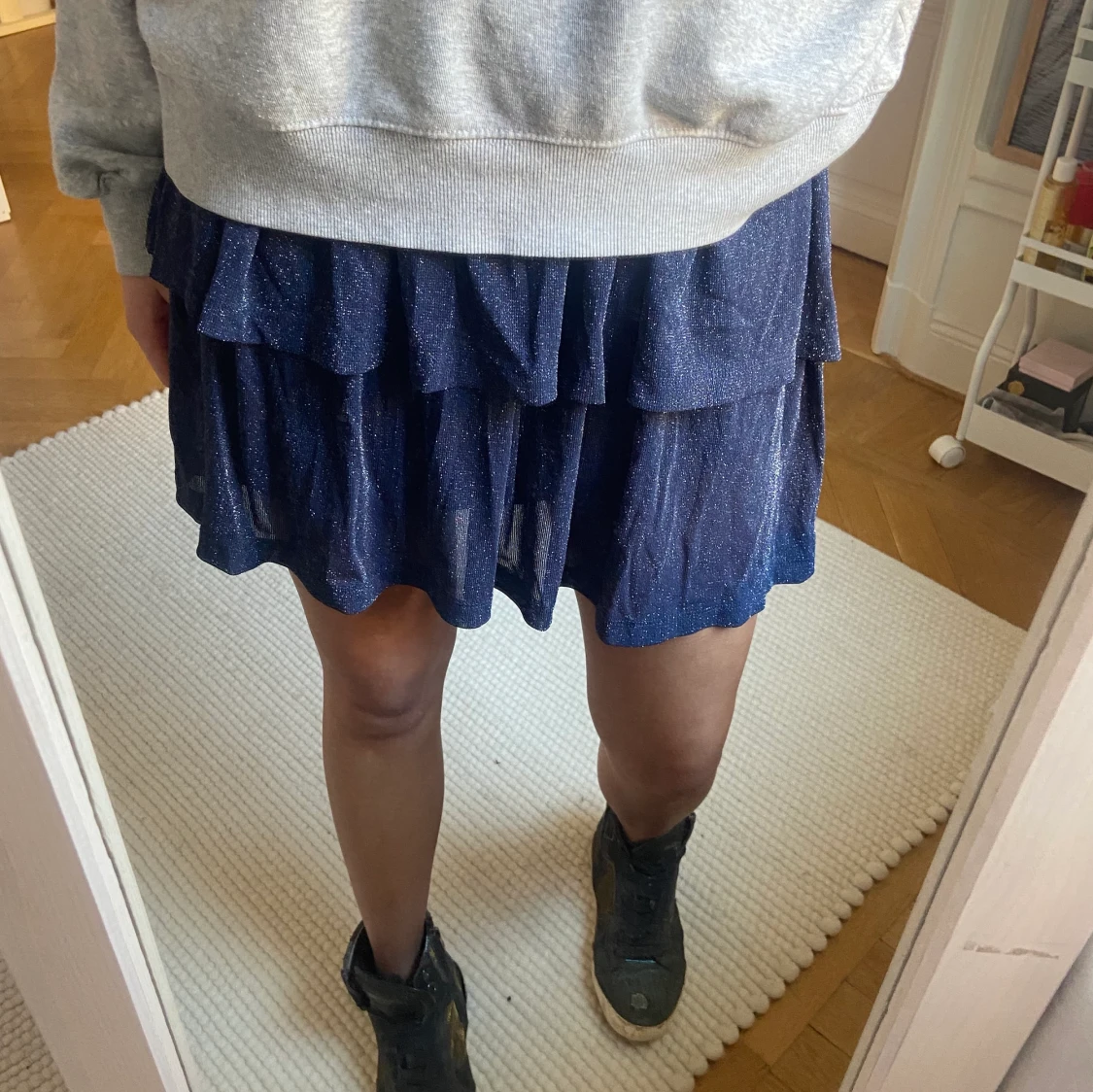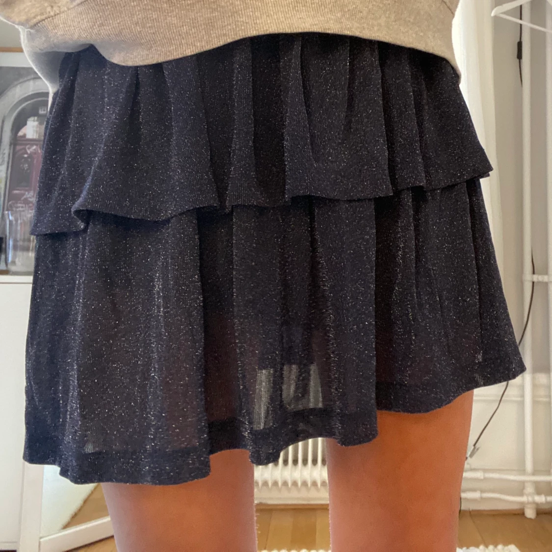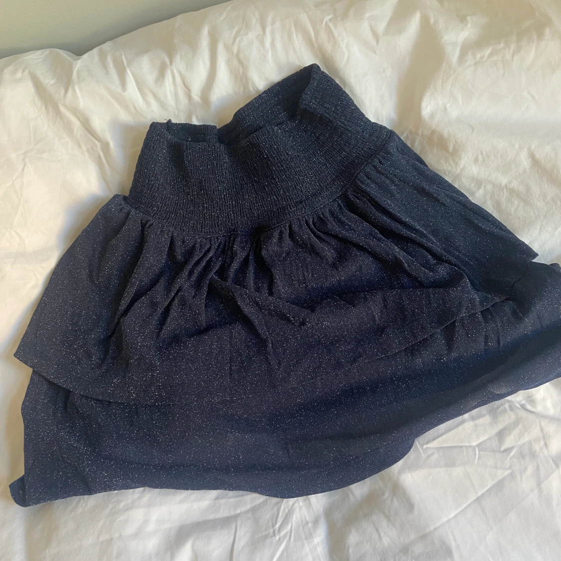 Superfin festlig kjol i storlek XS. Kort, mörkblå/glittrig i färgen, strächigt midja så passar många storlekar, knappt använd 💕