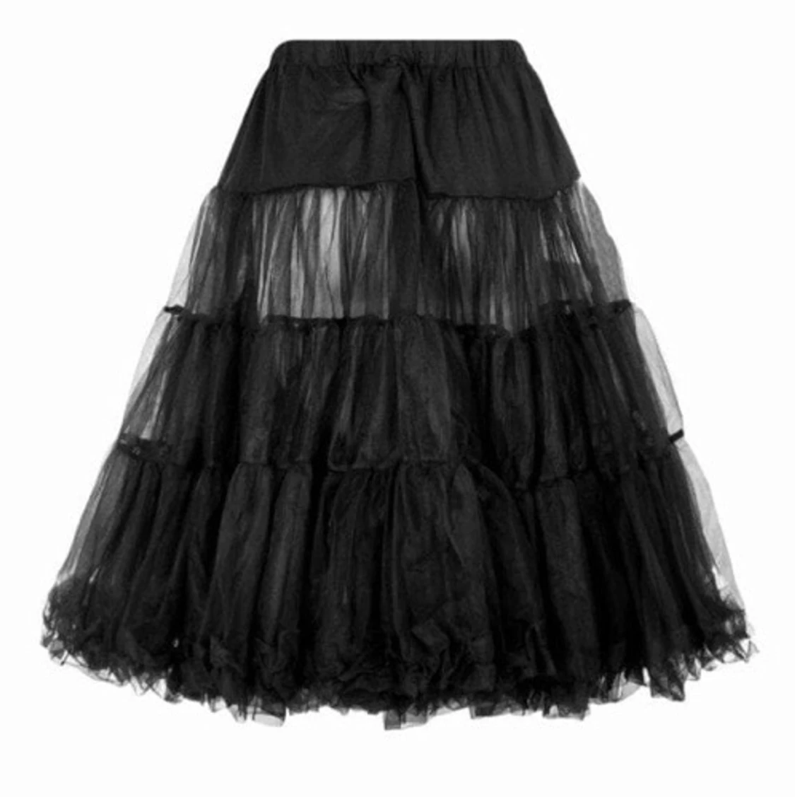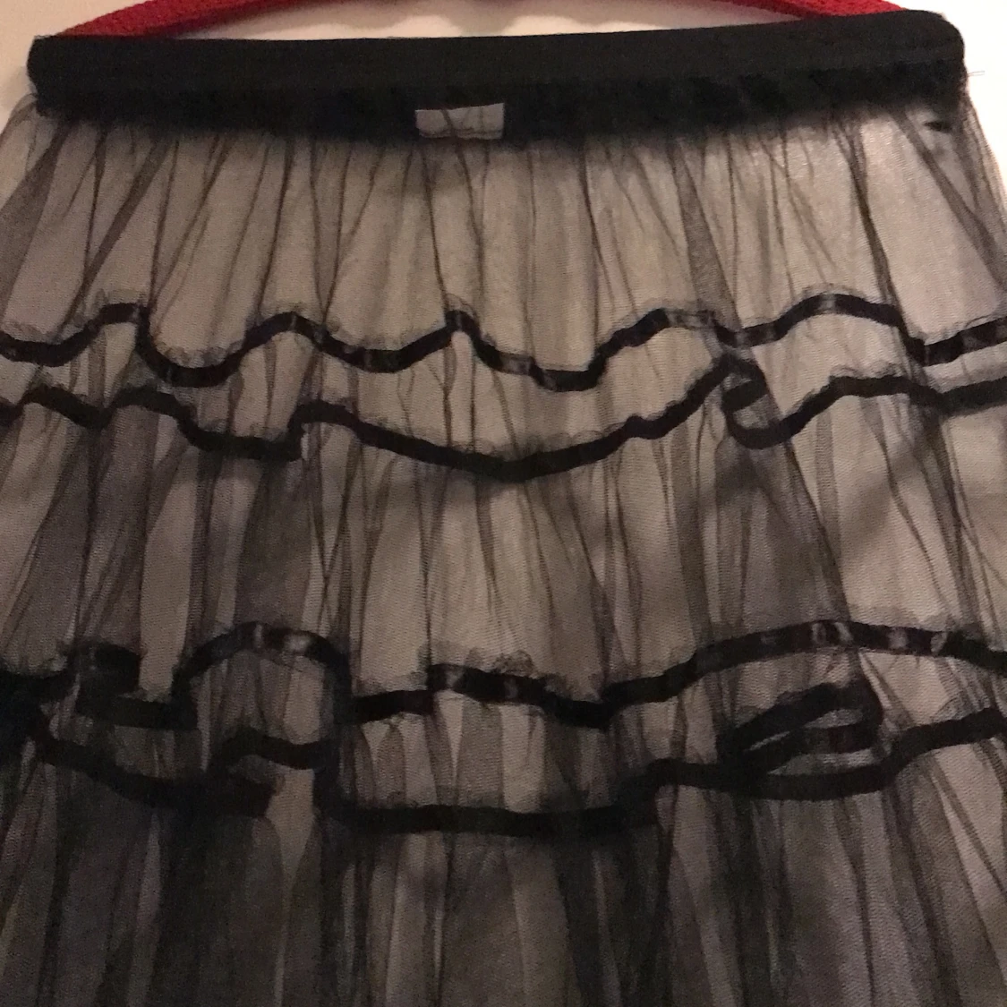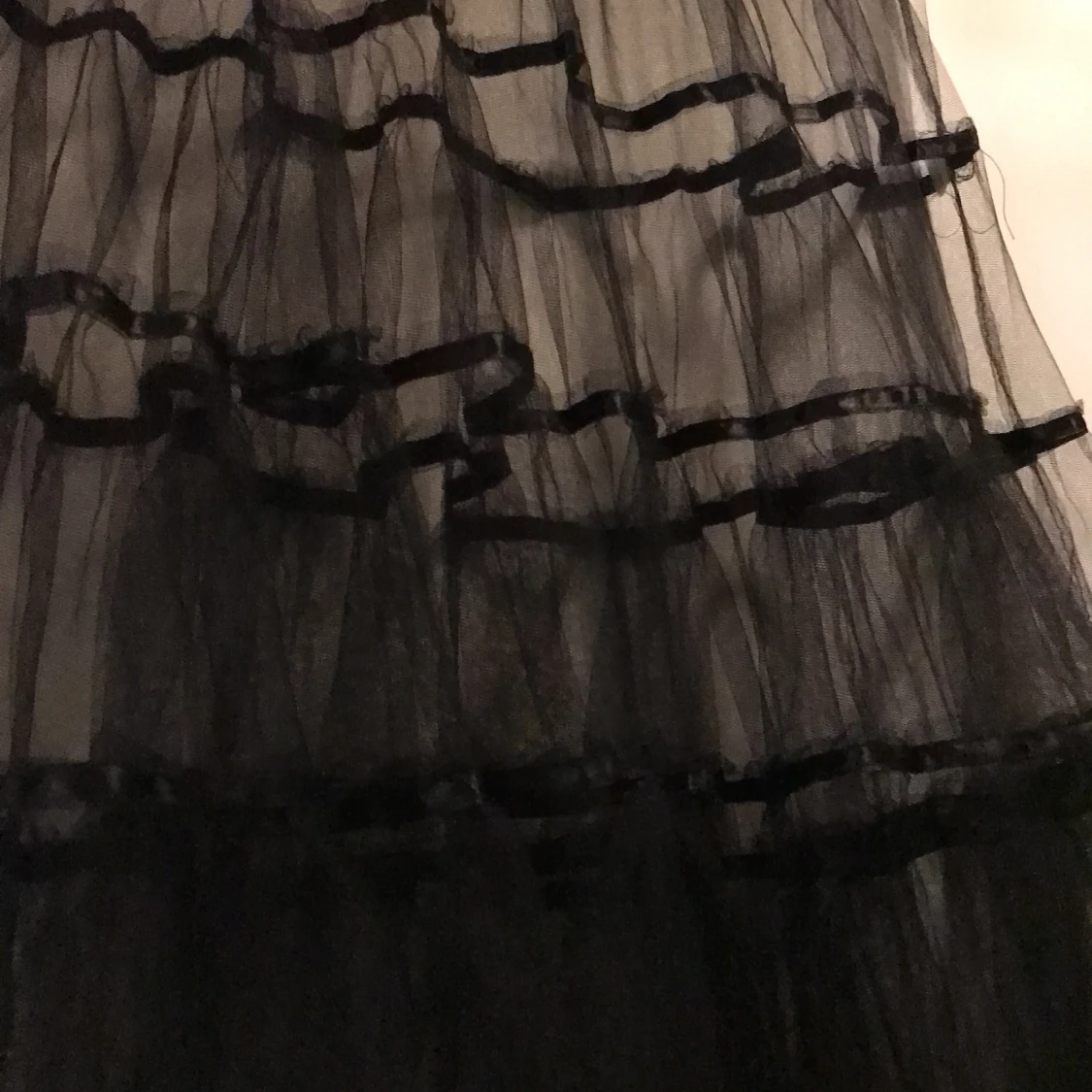 Kjolen passar stl small, är 103 cm lång och har en vidd av hela 15 m. Den kan antingen användas som underkjol, eller användas som den är. Den är sydd i våder som dekorerats med svarta satinband. Den vackraste tyllkjol du kan få