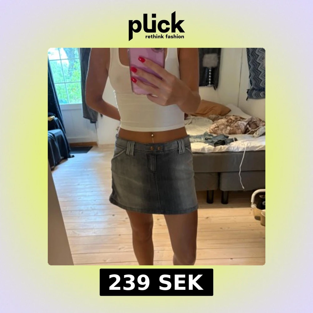 Snygg grå jeanskjol i kort modell. Kjolen har två stora bakfickor med lock och nitar, dubbla bälteshällor och två knappar fram. Perfekt för dig som gillar en cool och avslappnad stil. Jag har en storlek 32 och skulle rekommendera för 34.