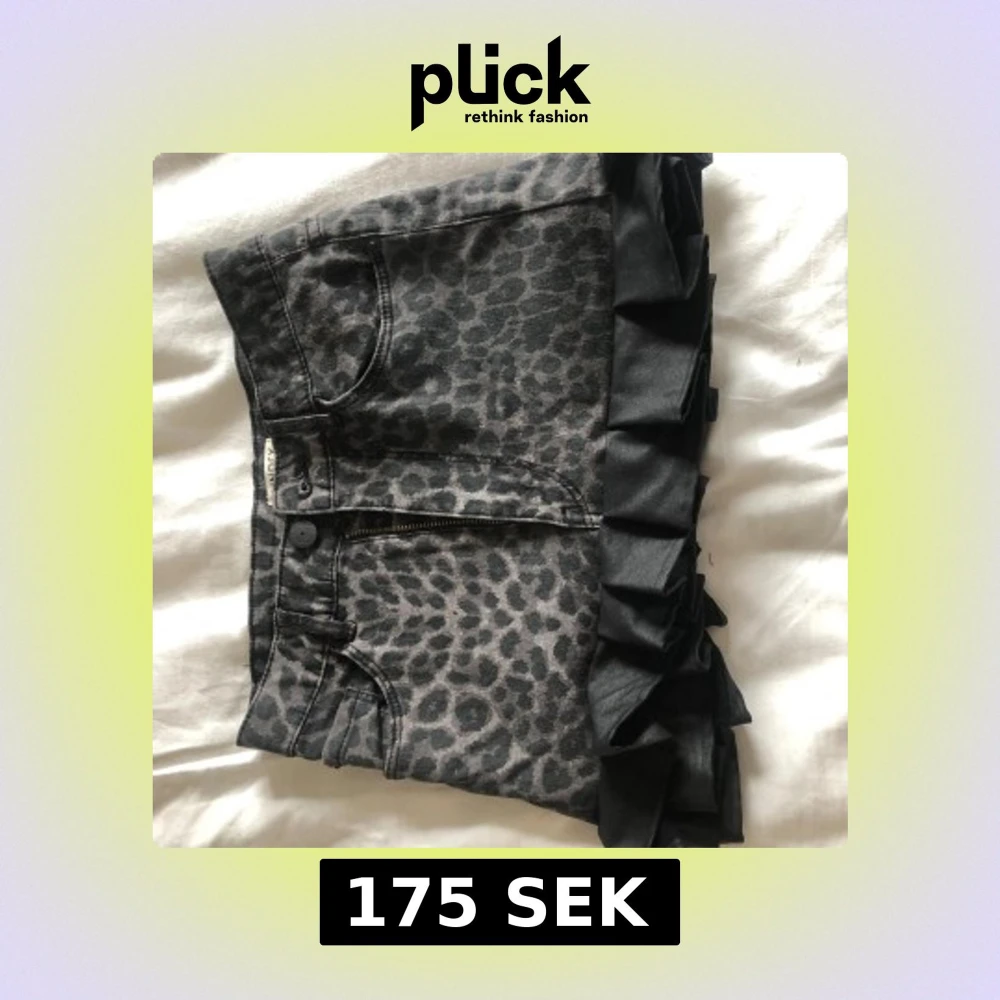Cool grå jeanskjol med leopardmönster och svarta volanger längst ner. Kjolen har fickor både fram och bak samt dragkedja och knapp framtill. Perfekt för dig som vill sticka ut lite extra.