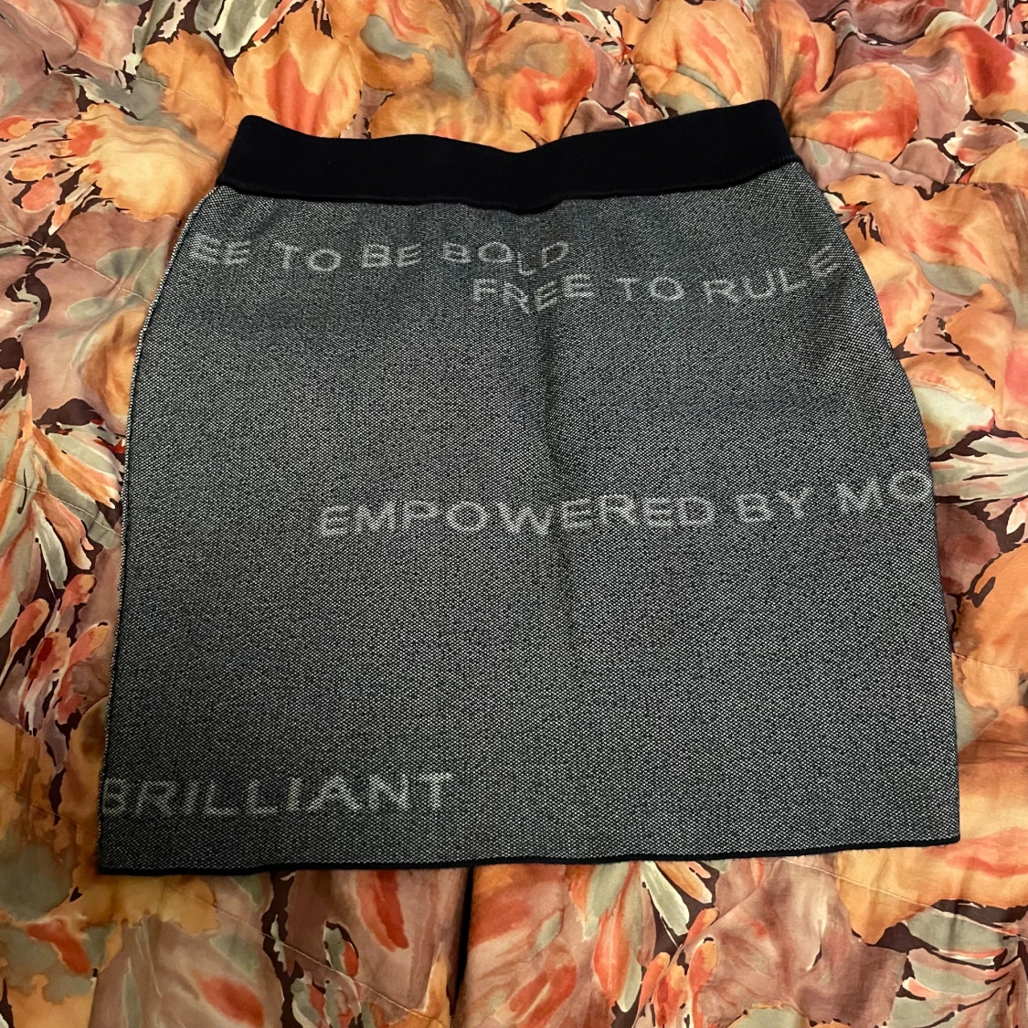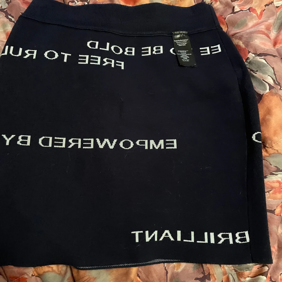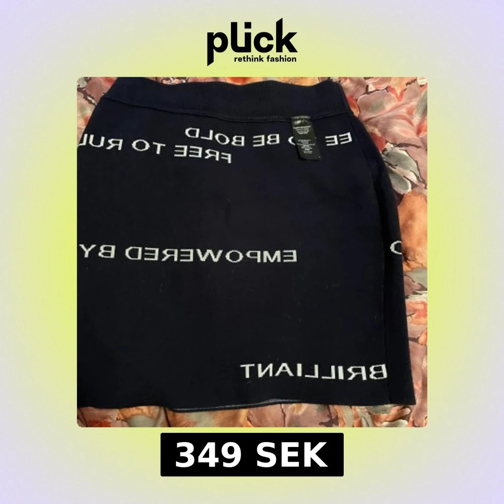 Snygg kortkjol från Peak Performance i grått och marinblått med stickade vita textdetaljer som 'EMPOWERED BY', 'BRILLIANT' och 'FREE TO BE BOLD'. Kjolen har bred resår i midjan och är tillverkad i ett mjukt, stickat material.