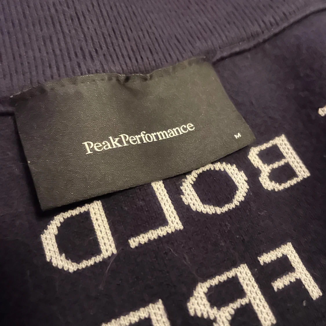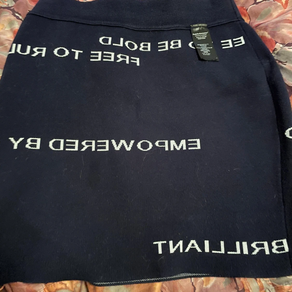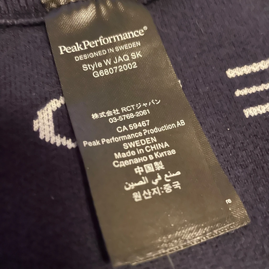 Snygg kortkjol från Peak Performance i grått och marinblått med stickade vita textdetaljer som 'EMPOWERED BY', 'BRILLIANT' och 'FREE TO BE BOLD'. Kjolen har bred resår i midjan och är tillverkad i ett mjukt, stickat material.