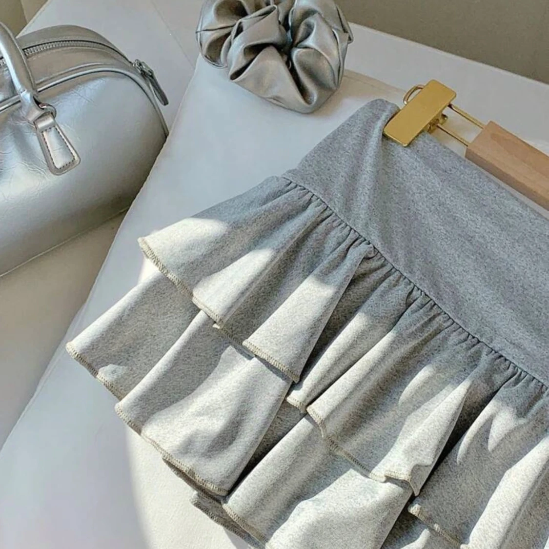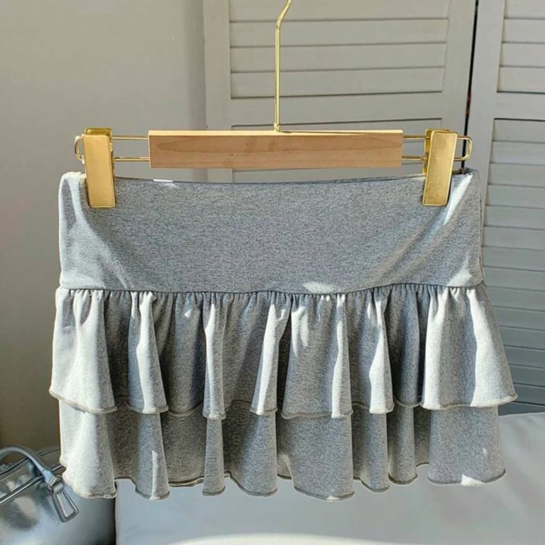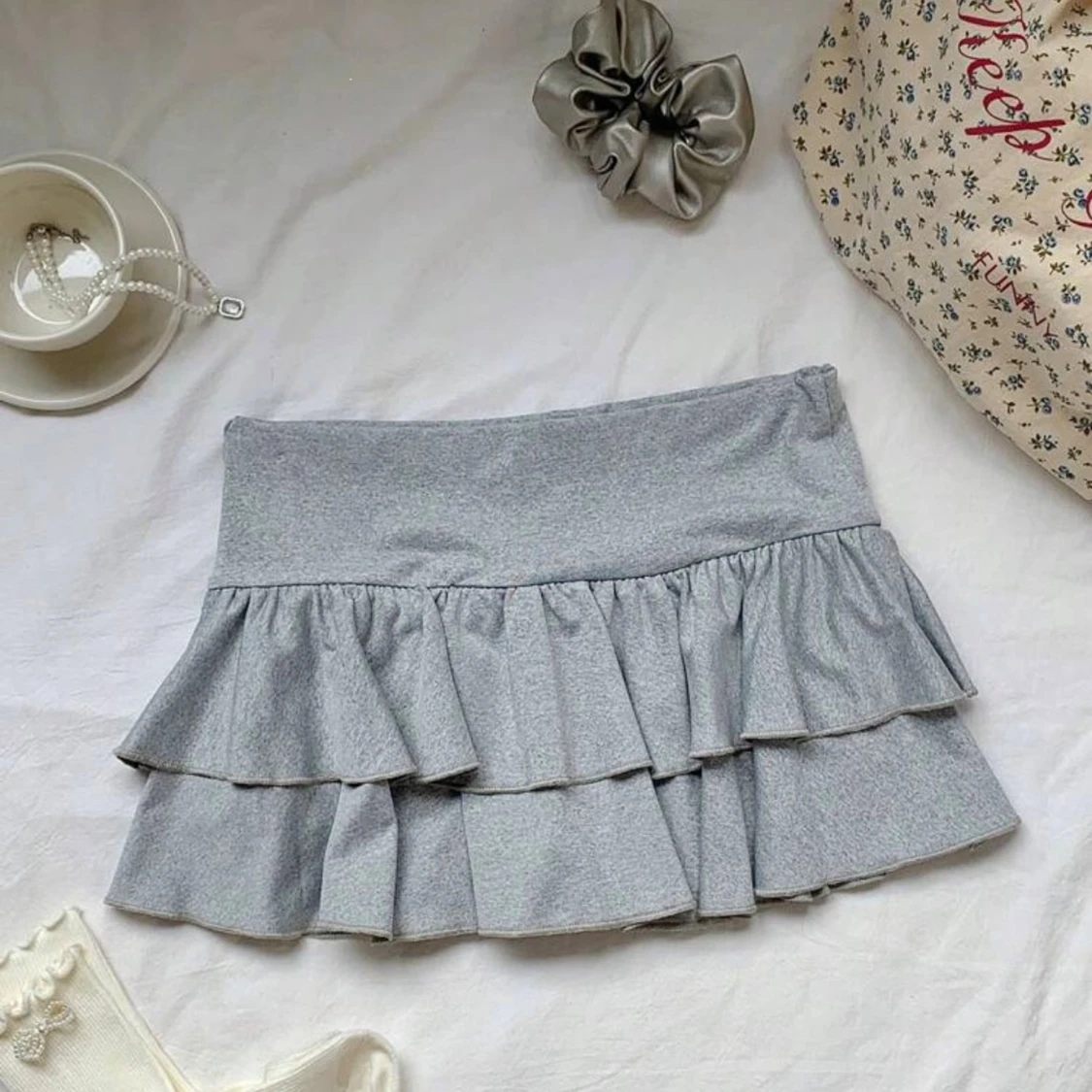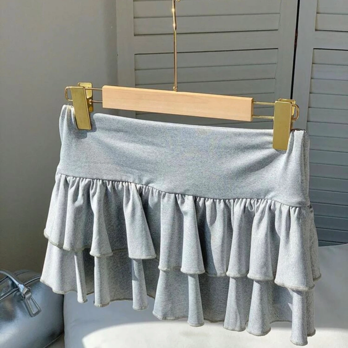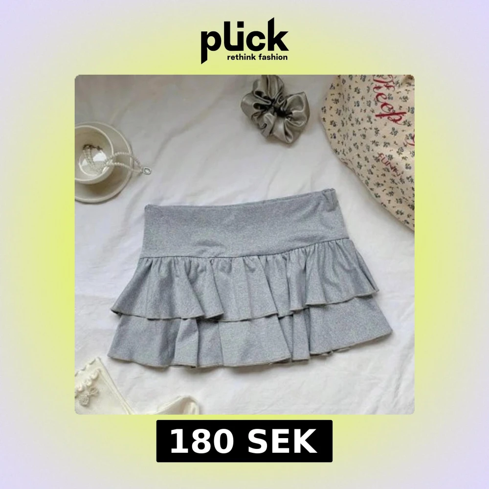 Supersöt grå kjol med dubbla volanger och bred midja. Kjolen sitter lågmidjat och har inbyggda shorts💗
