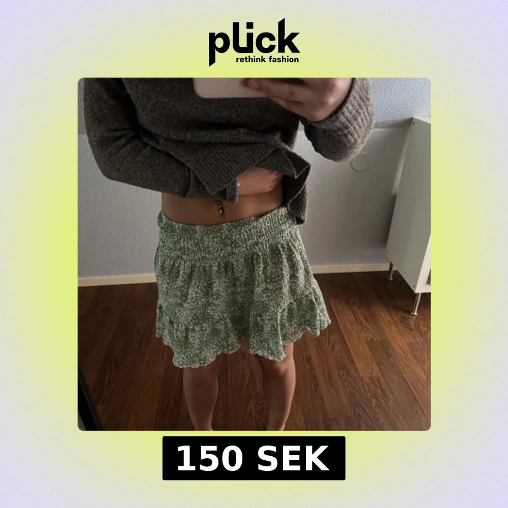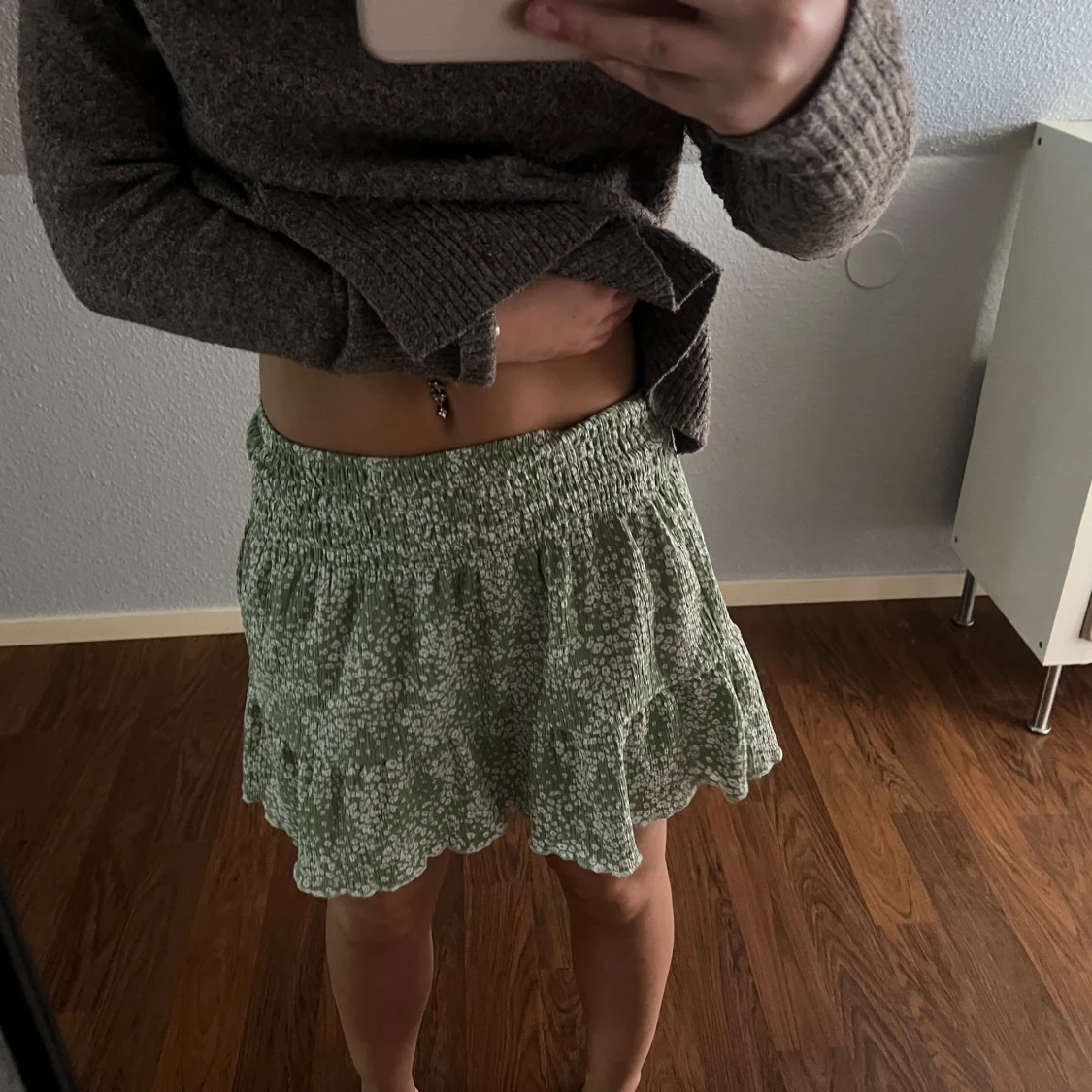 Supersöt grön kortkjol med vitt blommönster och volangkant. Kjolen har smock i midjan för en bekväm passform och är luftig och lätt, perfekt för varma dagar. Passar dig som gillar en avslappnad och trendig stil.