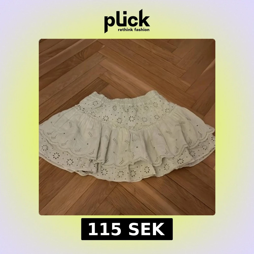Supersöt grön kjol med broderade blommor och volangkant. Kjolen har elastisk midja och är i kort modell. Perfekt för en somrig look.