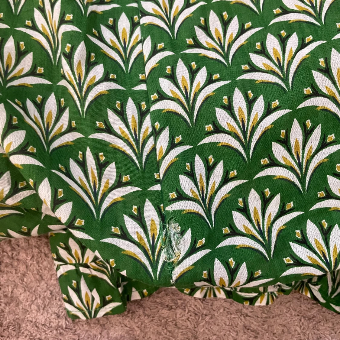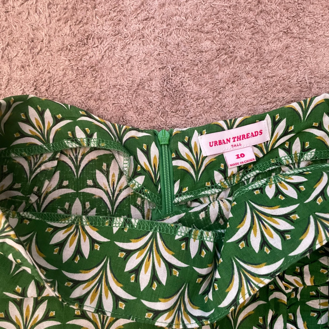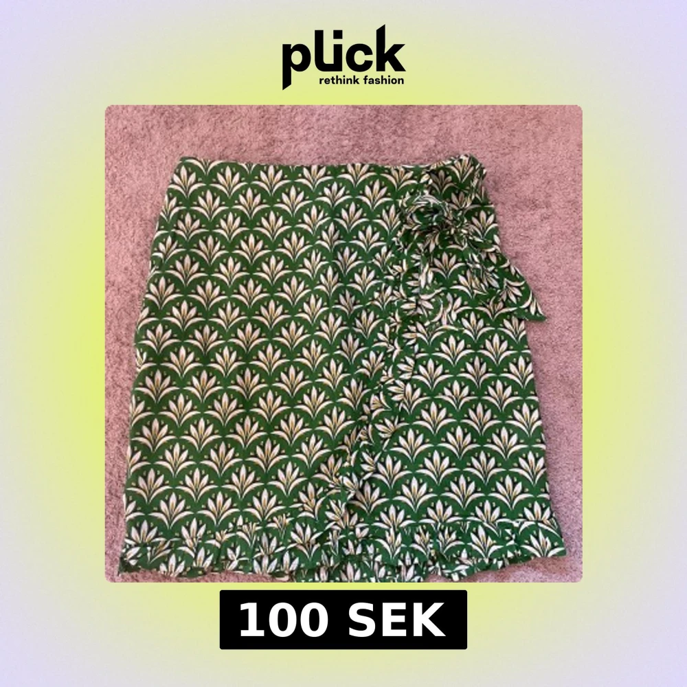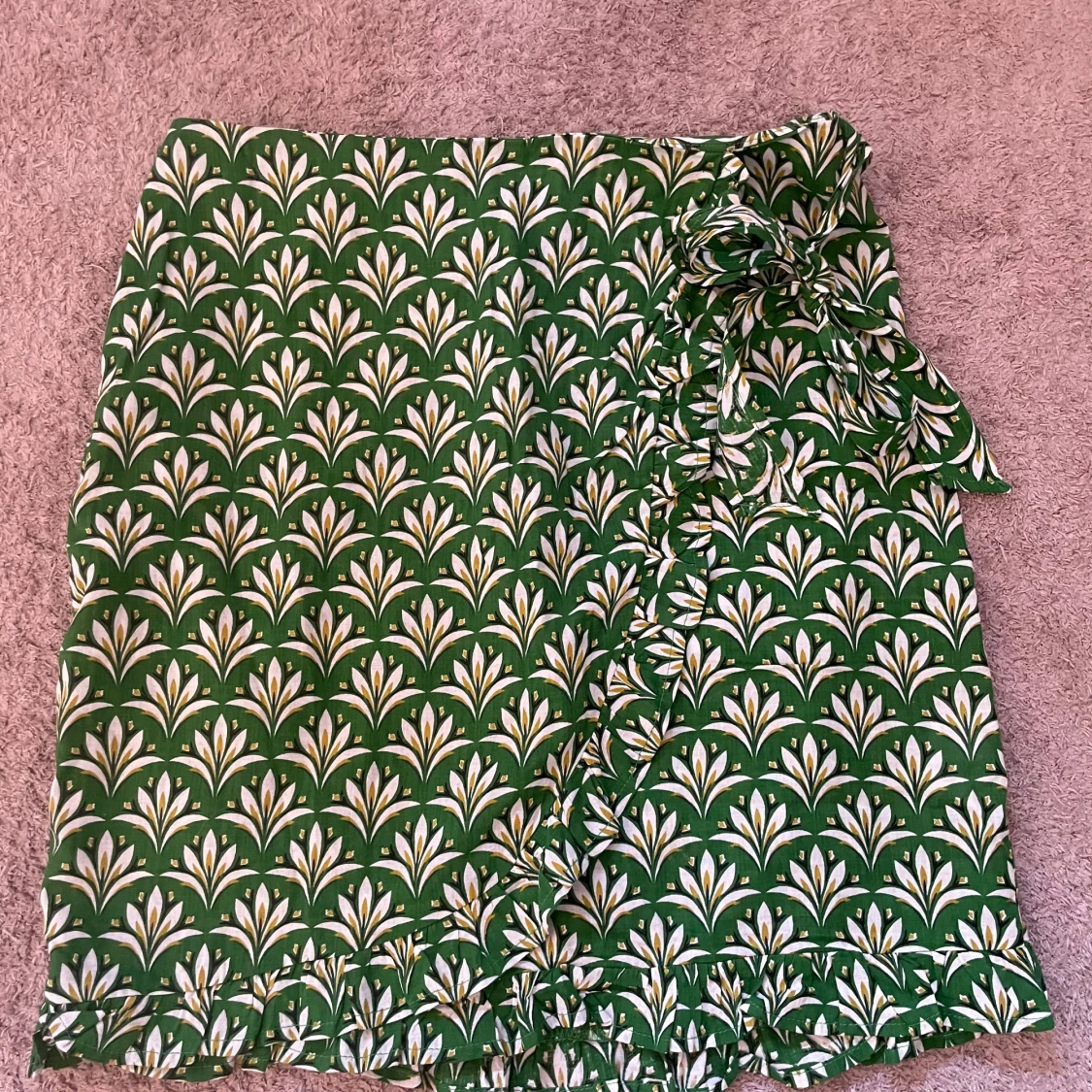 Superfin grön kortkjol från Urban Threads med vitt och gult blommönster. Kjolen har omlottmodell med volangkant och en söt rosett i midjan. Perfekt för vår och sommar när du vill sticka ut lite extra!