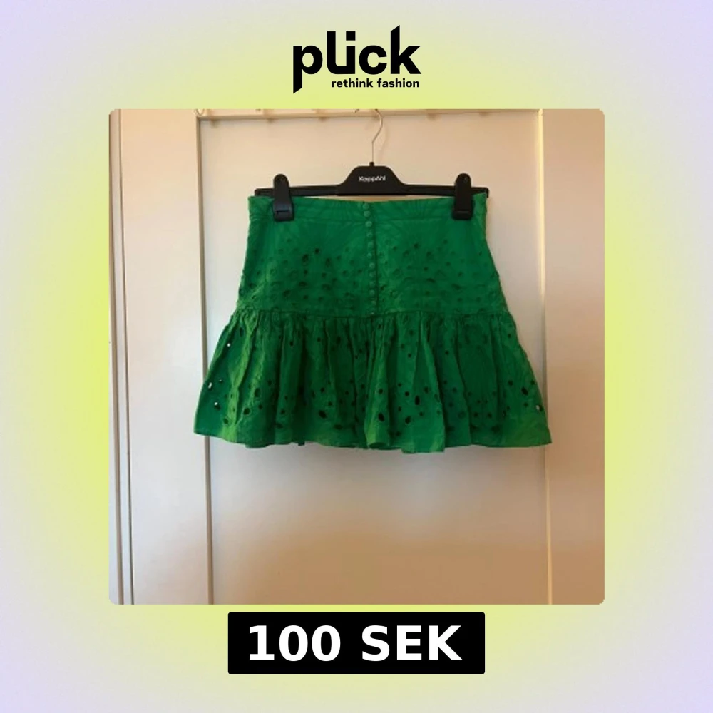 Snygg grön kjol från Zara med broderade detaljer och volang. Kjolen har en kort längd och knappar framtill. Perfekt för att ge en färgklick till din outfit! Funkar för de som har s och även xs!