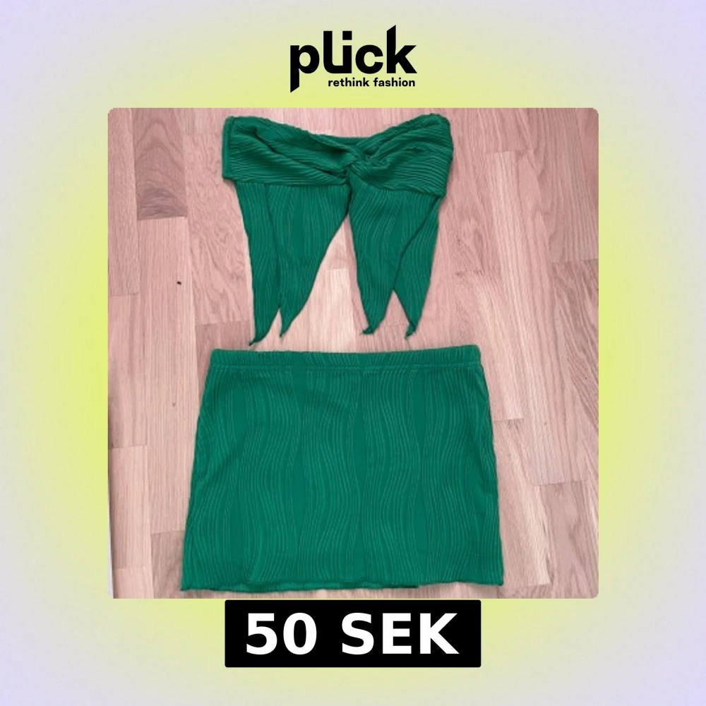 Snygg grön kjol med matchande tubtopp. Kjolen har en kort längd och ett subtilt ribbat mönster som ger en cool textur. Toppen är en tubtopp med knytning framtill, vilket ger en trendig look. Perfekt för sommarens äventyr!