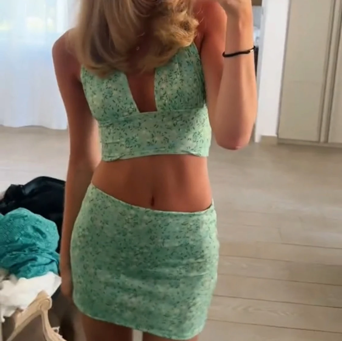 Jättefint blommigt grönt set från Nelly! Toppen och kjolen har en tight passform och är sydd i ett lätt material som passar perfekt till varma dagar.