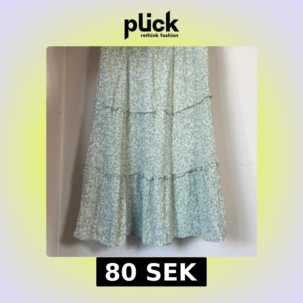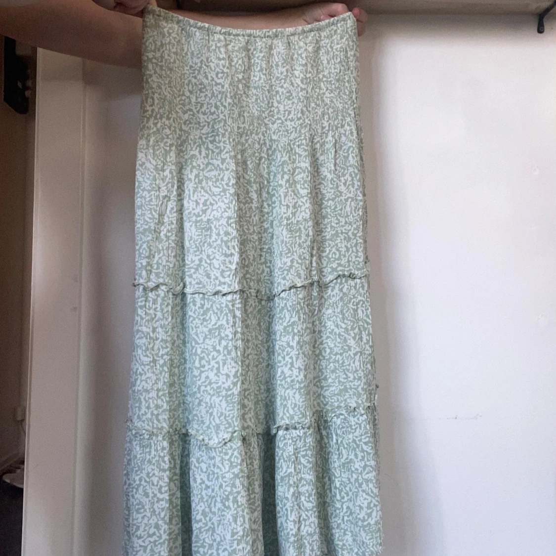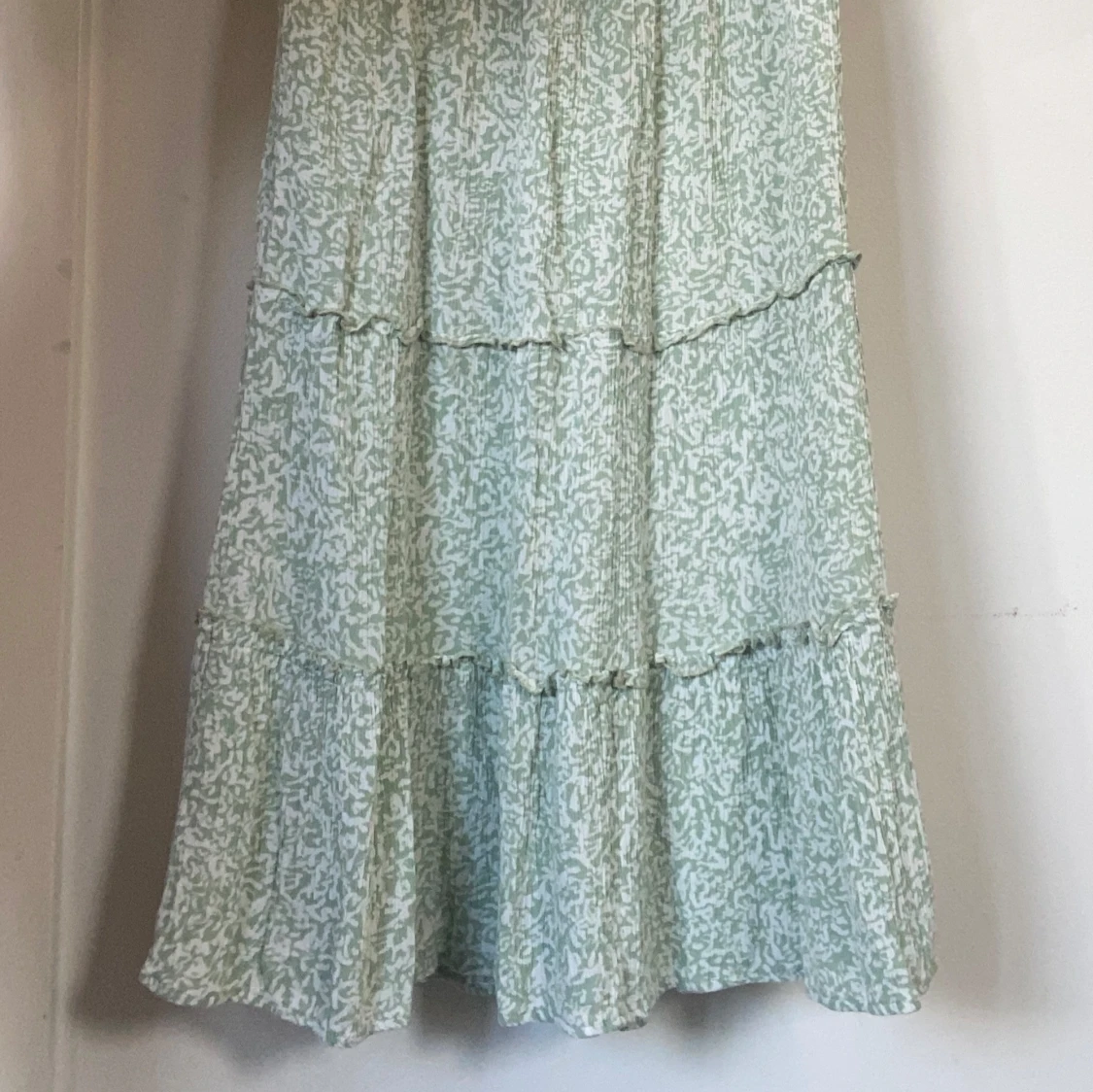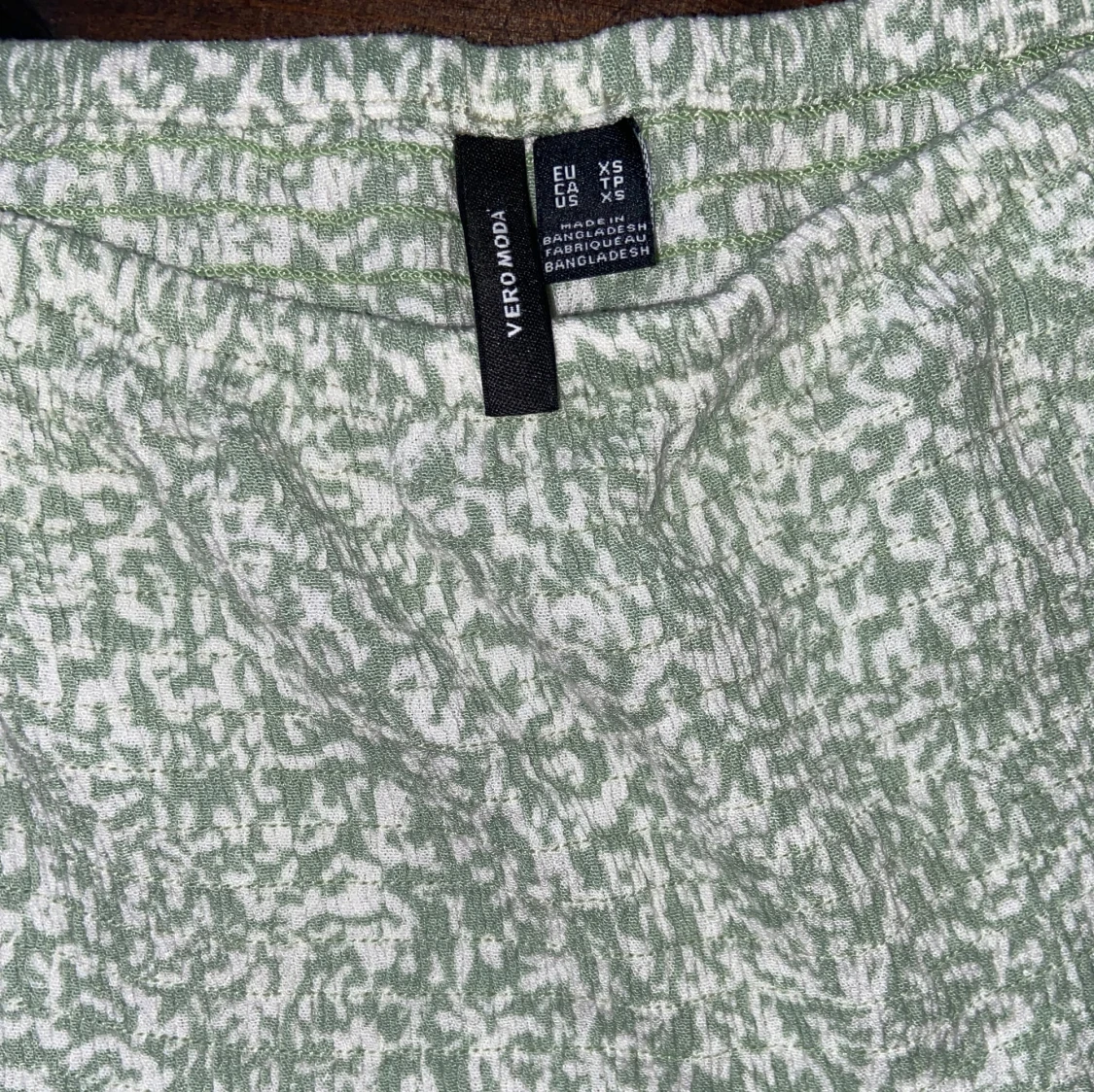 Långkjol från Vero Moda i storlek XS men passar även S. Kjolen är ljusgrön med vitt abstrakt mönster, har volanger i flera lager och resår i midjan. Perfekt flowy och luftig för varmare dagar. Använd ett fåtal gånger men i nyskick.