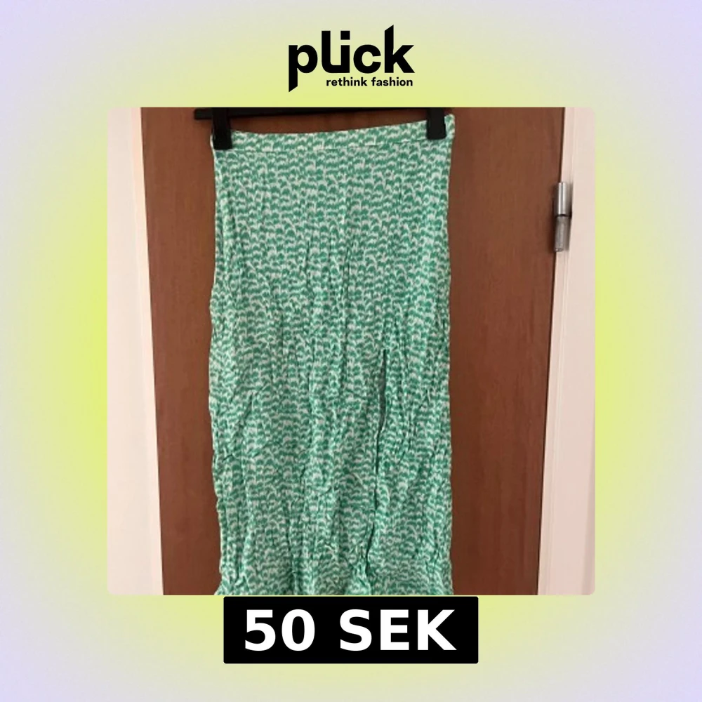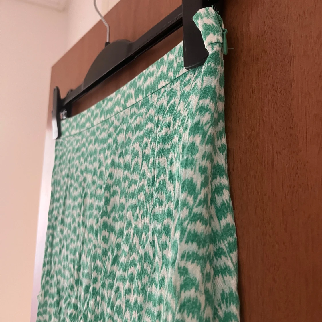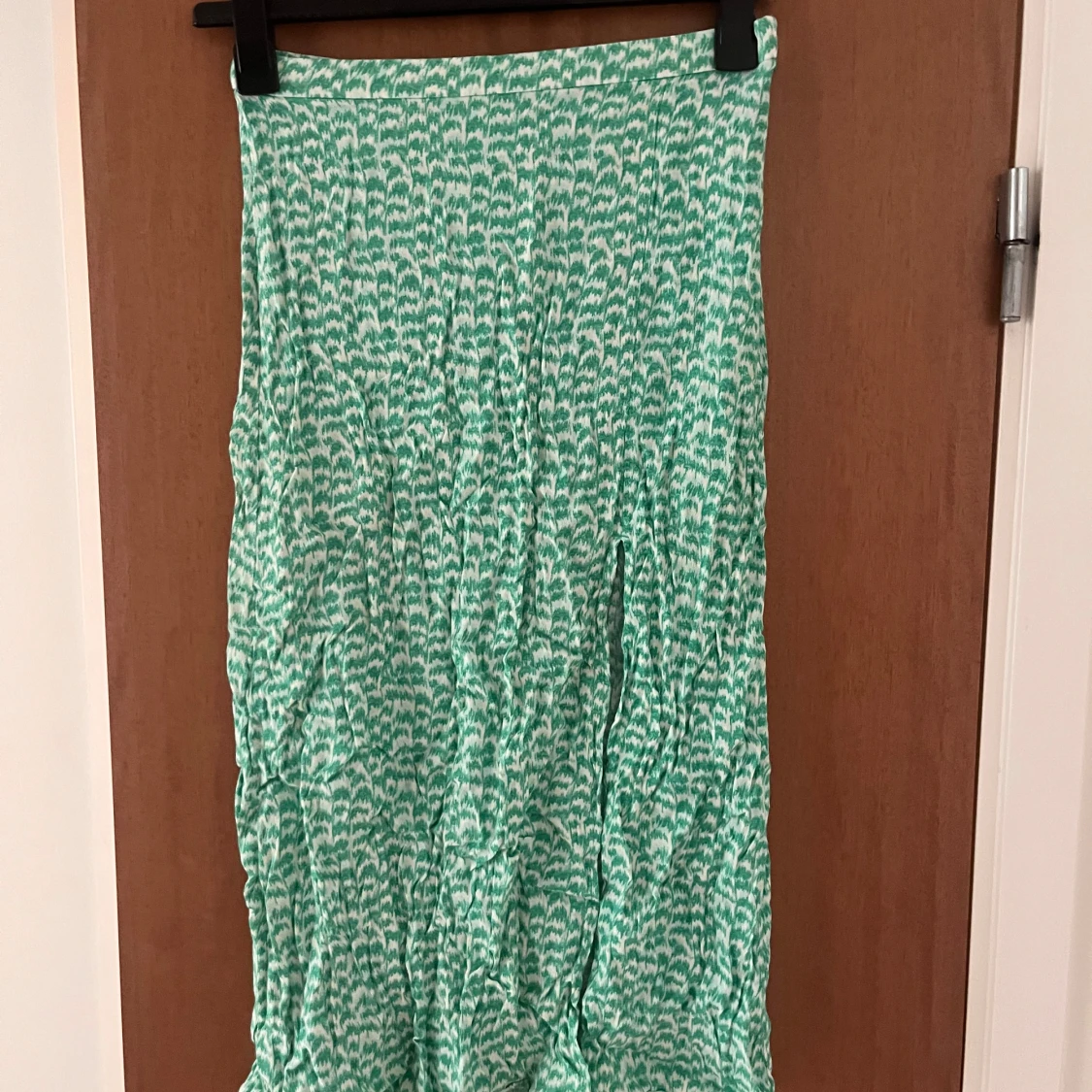 Snygg långkjol i grönt och vitt med ett unikt mönster. Kjolen har en hög slits på ena sidan och dragkedja på ena sidan