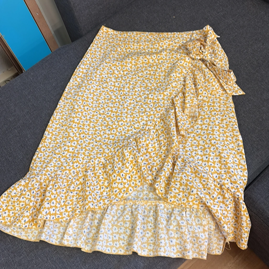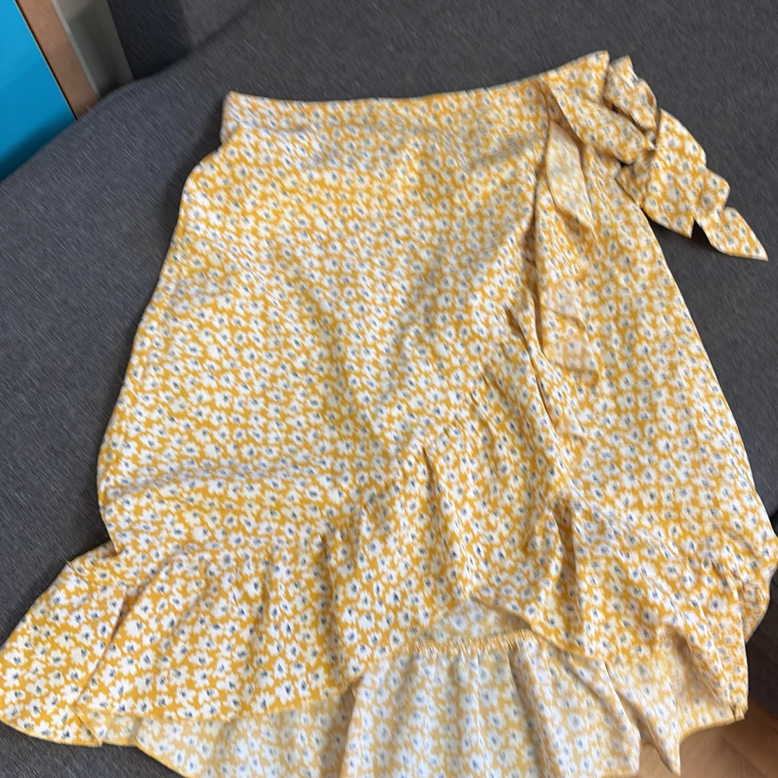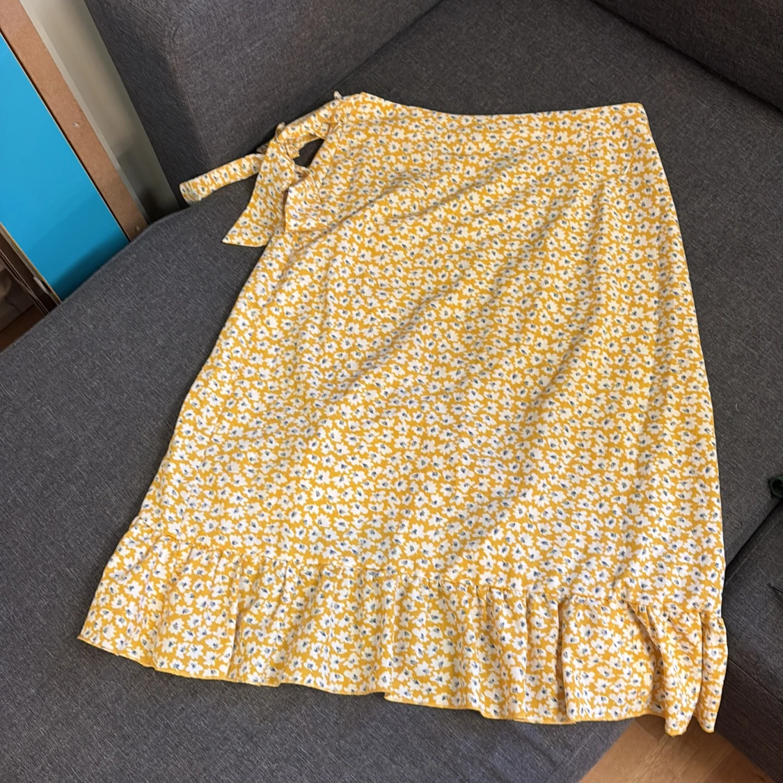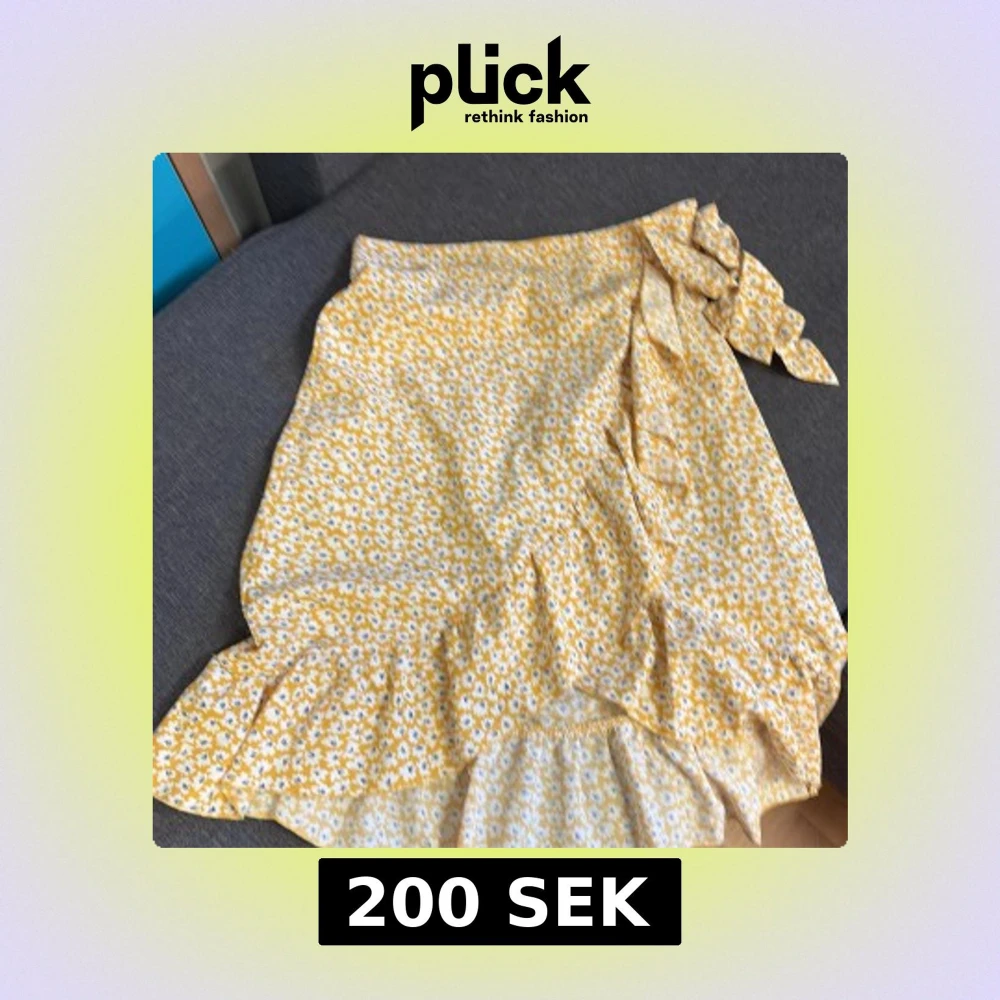 Säljer en söt gul omlottkjol med vitt blommönster och volangkant. Kjolen har knytband i midjan och är perfekt för varma dagar. Lätt och luftig modell som ger en somrig känsla.