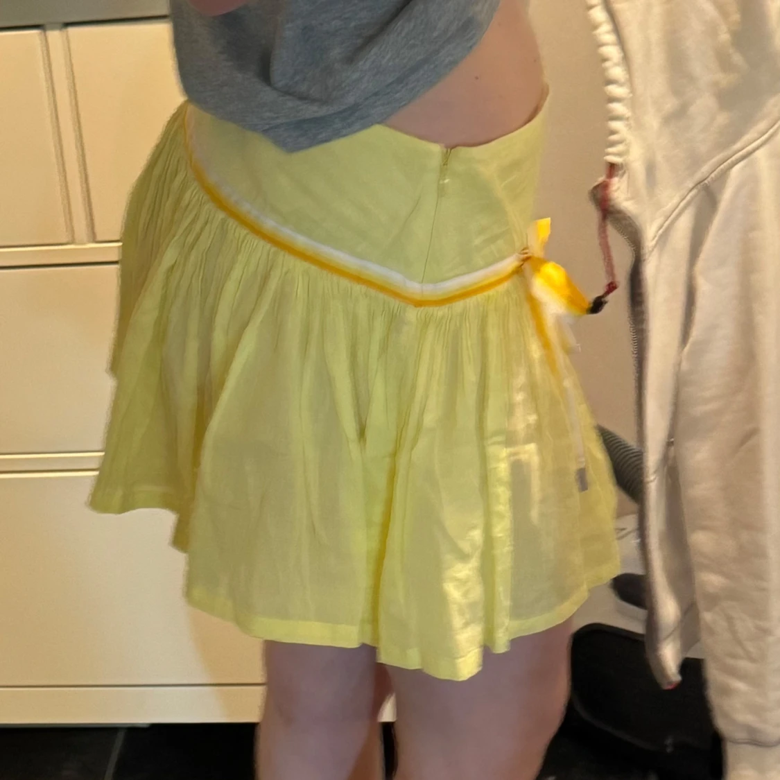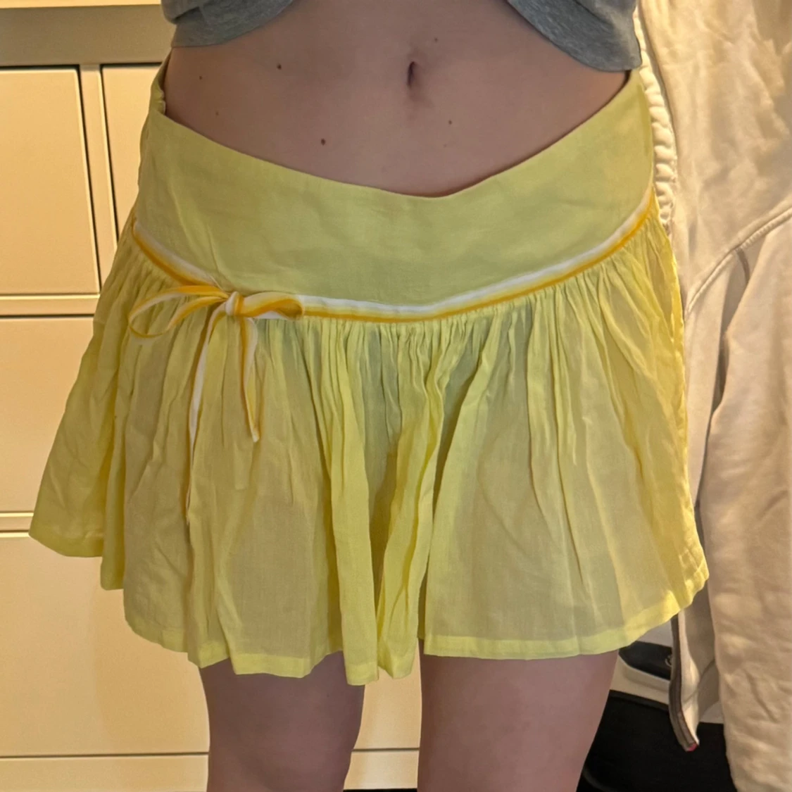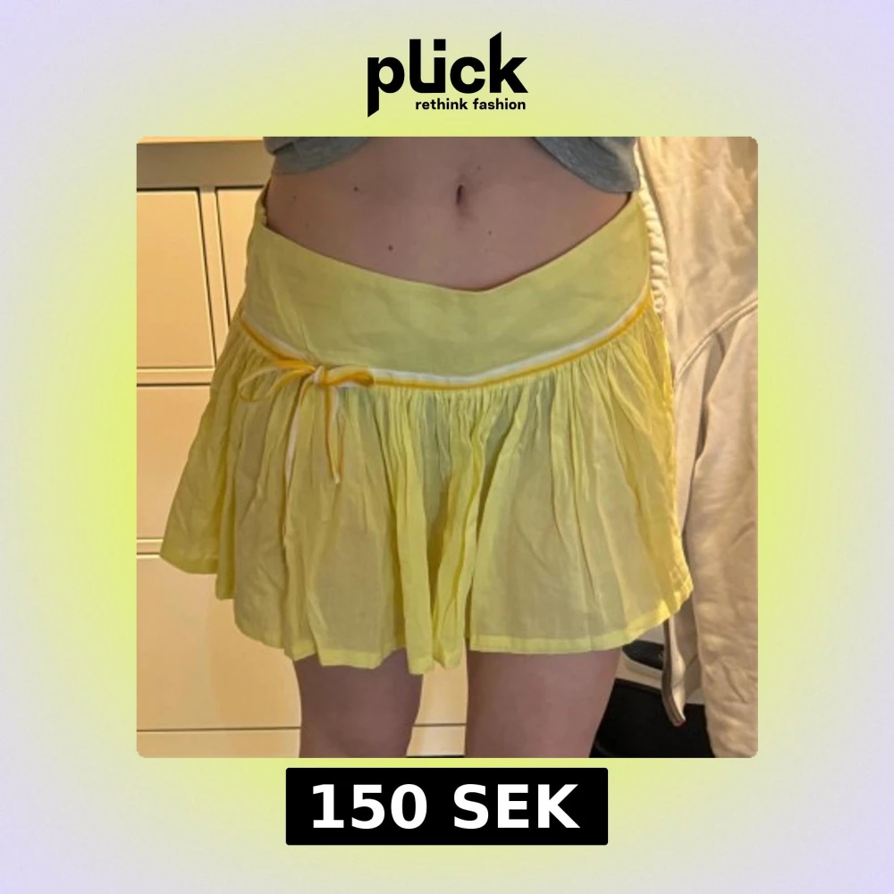 Säljer en söt gul kortkjol med volang och knytband i midjan. Kjolen har en bred midjeresår och är gjord i ett tunt, luftigt material. Perfekt för varma dagar och ger en fräsch look.